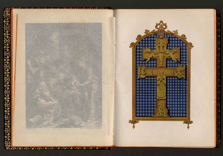 Missel des croisades. Paroissien Romain complet en Latin et en Francais. Limoges, J. Depellev & Cie., o.J., um 1910. Ca. 14,5 x 11 cm. (16) S., 504 Seiten. Mit einer Farblithographie und zahlreichen Illustrationen. Ledereinband der Zeit mit Rücken- und Deckelvergoldung sowie reicher Innenkantenvergoldung. Innendeckel und Vorsatz mit roter Seide. Mit Goldschnitt. Besitzstempel auf weißer Vorsatzseite. Buchblock etwas gelockert. In französischer Sprache.