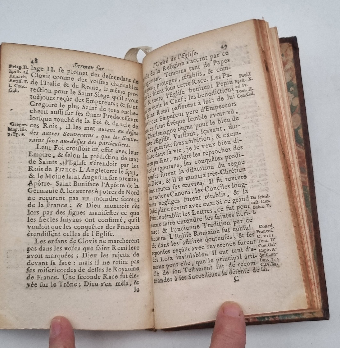 Bossuet, Jacques Benigne: 1) Maximes et reflexions sur la comedie; 2) Meditations sur la remission des pechez pour le tems du jubilé, et des indulgences; 3) Sermon sur l’unité de l’eglise presche. 3 Teile in einem Band. Paris, Delusseux, 1726-1729. Ca. 17 x 10 cm. (8) S., 152 Seiten; (12) S., 123 S., (5) Seiten; (2) S., 83 S., (1) Seite. Ledereinband der Zeit mit gedrucktem Rückenschild. Rücken mit kleinen Fehlstellen, sonst gutes Exemplar. In französischer Sprache.