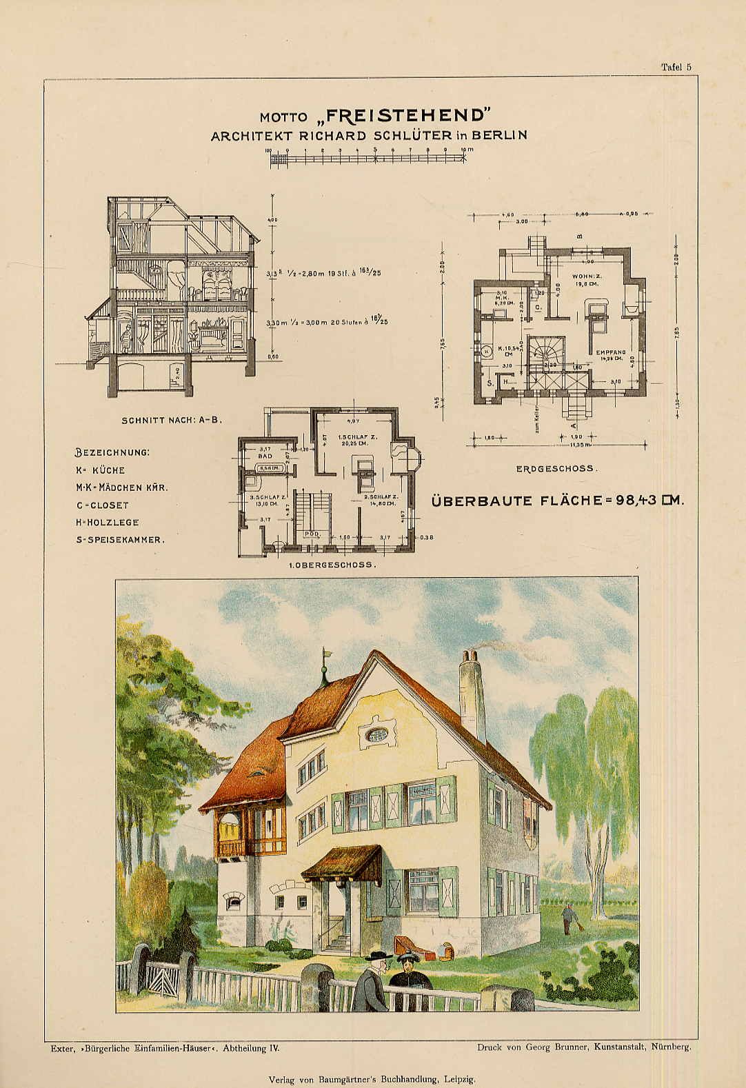 Exter, August: Das deutsche bürgerliche Einfamilienhaus. Eine Sammlung von Entwürfen deutscher Architekten für Einfamilienhäuser des gebildeten Mittelstandes. In sechs Abtheilungen. Hier: Abtheilung IV: Haus mit fünf Zimmern, Küche und mehreren Kammern. Leipzig, Baumgärtner, 1899. Ca. 46 x 34 cm. VIII S., 4 Tafeln in Chromolithographie und 14 Tafeln in Photolithographie. Orig.-Halbleinenmappe. Mit Beispielen der Architekten Franz Thyriot, Arthur Biberfeld, Richard Schlüter, Helbig und Haiger, Richard Senf, Ludwig Stadler, Gustav Steinlein, Aug. Exter (Villenkolonie Pasing). Einband etwas berieben und gebräunt. Die schönen Tafeln sauber und gut.
