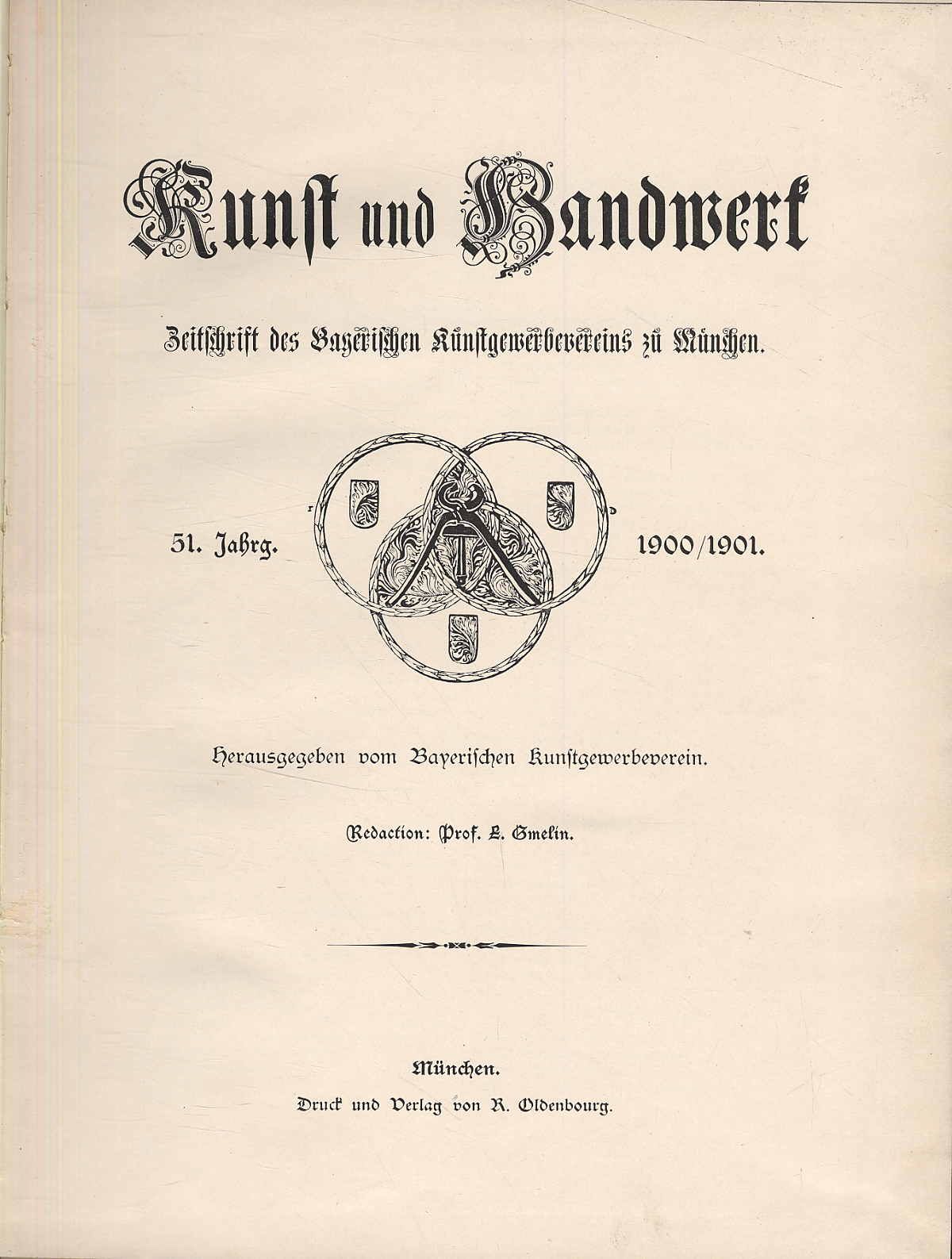 Kunst und Handwerk. Zeitschrift des Bayerischen Kunstgewerbevereins zu München. 51. Jahrgang 1900/1901. München, R. Oldenbourg, 1900-1901. Ca. 31,5 x 24,5 cm. VIII S., (2) S., 363 Seiten. Mit zahlreichen Illustrationen (auch einigen farbigen). Halbleinenband der Zeit mit goldgeprägtem Rückentitel. Einband etwas bestoßen und berieben. Aus dem Inhalt u.a.: Moderne Keramik auf der Pariser Weltausstellung; Die Ausstellung der Darmstädter Künstlerkolonie; Auguste Varnest; Richard Riemerschmids Schauspielhaus; Hermann Götz; Wettbewerbe, Ausstellungen, Künstler und Werkstätten.