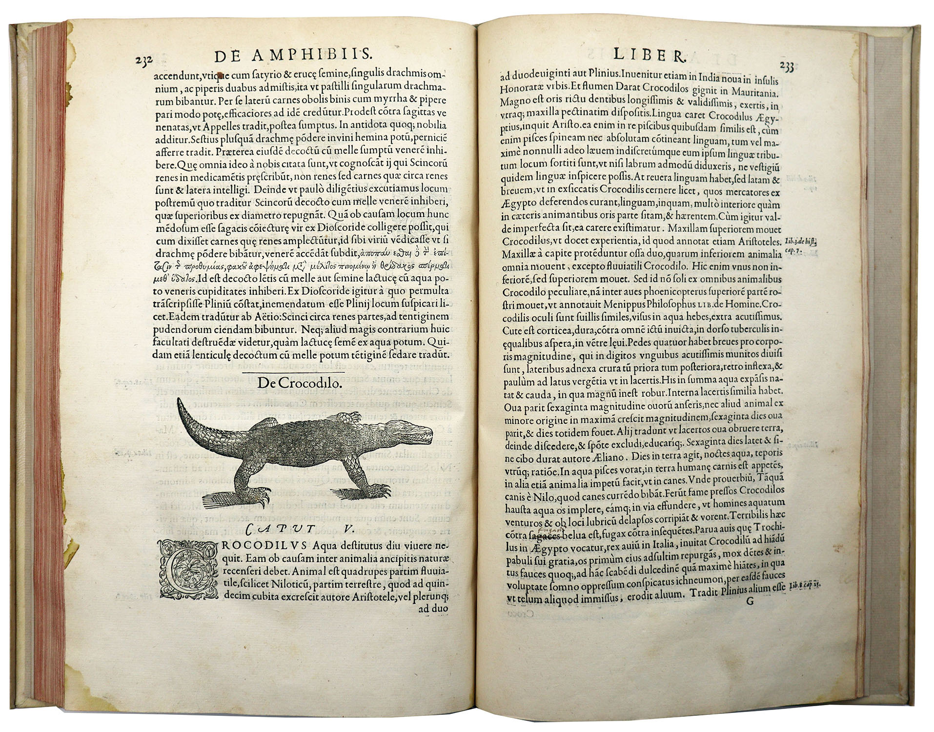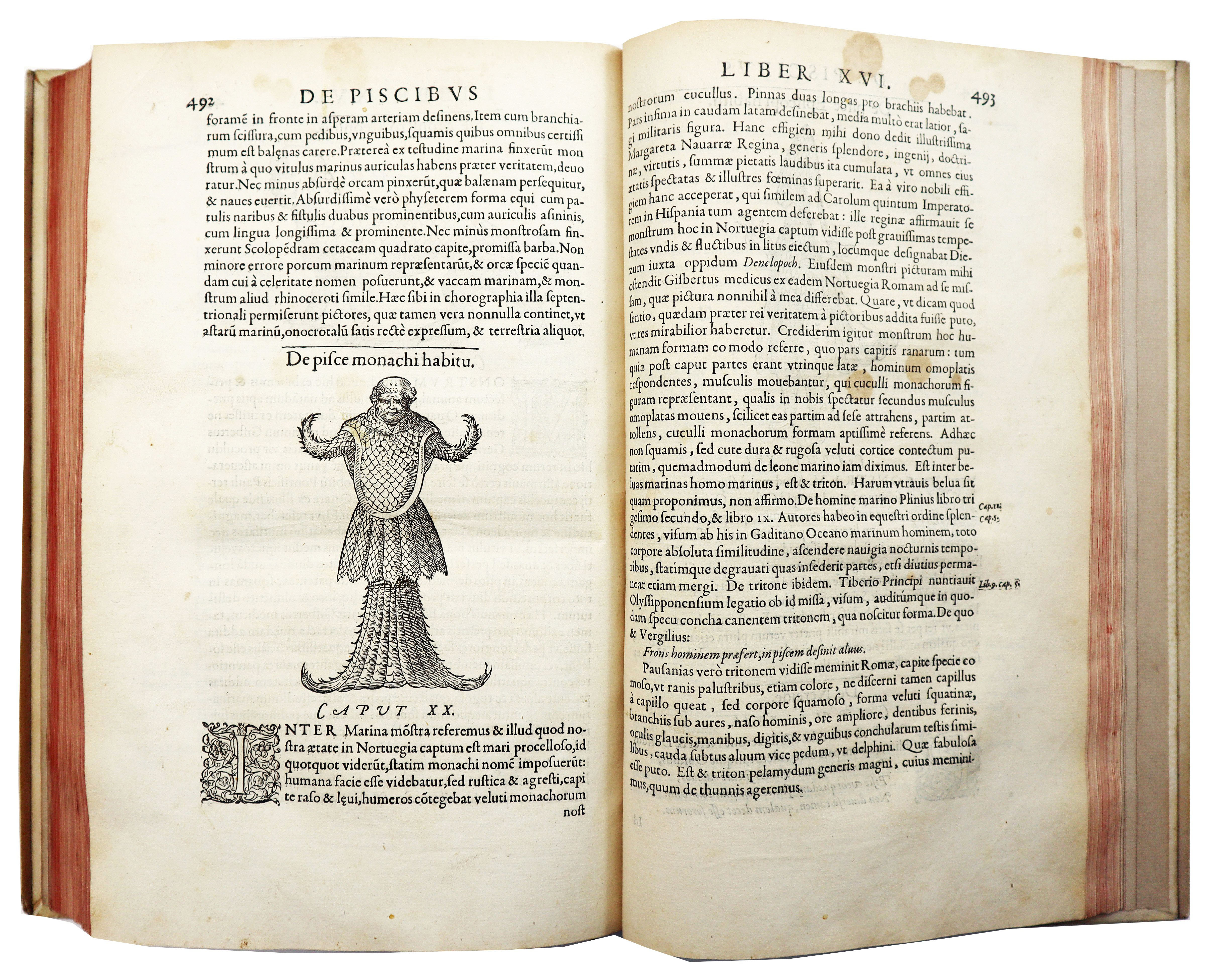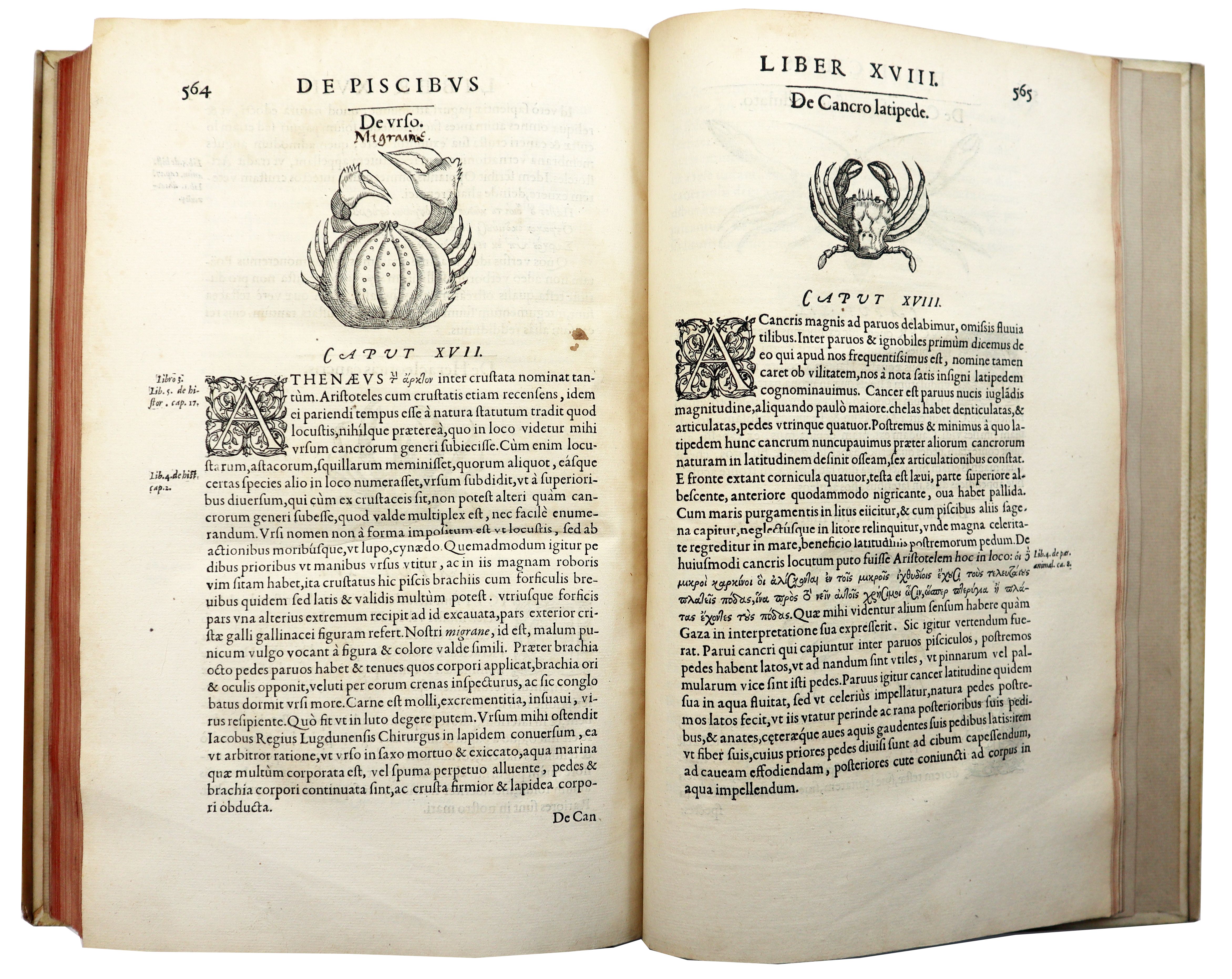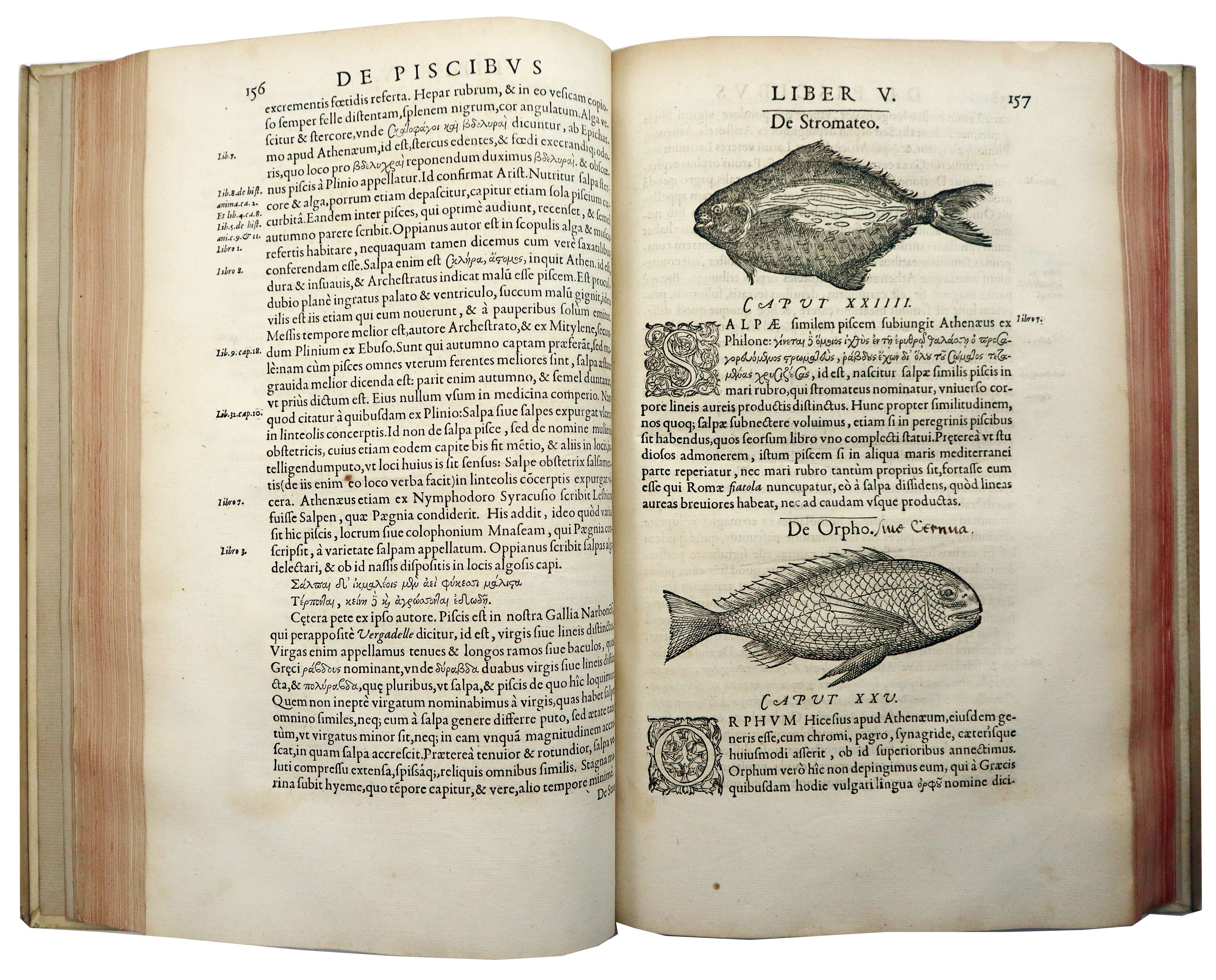 Rondelet, Guillaume: Libri de Piscibus Marinis, in quibus verae Piscium effigies expressae sunt. Quae in tota Piscium, historia contineantur, indicae Elenchus pagina nona decima. Postremò accesserunt Indices necessarij. 2) Universae aquatilium Historiae pars altera, cum veris ipsorum Imaginibus. His acceßerunt Indices neceßarii. 2 Bände. Lugduni (Lyon) Matthias Bonhomme, 1554-1555. C.a. 33,5 x 21 cm. (16) S., (24) Seiten Register, 583 Seiten; (10) S., 242 S., (10) Seiten Register. Mit Druckermarke, Porträt und 470 Holzschnitten . Späterer Ganzpergamentbände. Erste Ausgabe. Nissen Fischbücher 83; Brunet IV, 1372. Text in Latein. Vorsätze erneuert. In Band 2 wurde ein Blatt mit dem sich aus Band 1 wiederholenden Porträt nicht miteingebunden (liegt als Farbkopie bei). Teils von alter Hand mit Tinte ergänzte französische Namen der abgebildeten Tiere. Band 1 anfangs leicht wasserfleckig. Jedoch insgesamt von guter Erhaltung. Rondelet (1507-1566, französischer Arzt und Naturforscher) lehrte an der Medizinischen Fakultät von Montpellier. Ab 1540 Leibarzt des Kardinals von Tournon, in dessen Begleitung bereiste er Holland und Italien.
