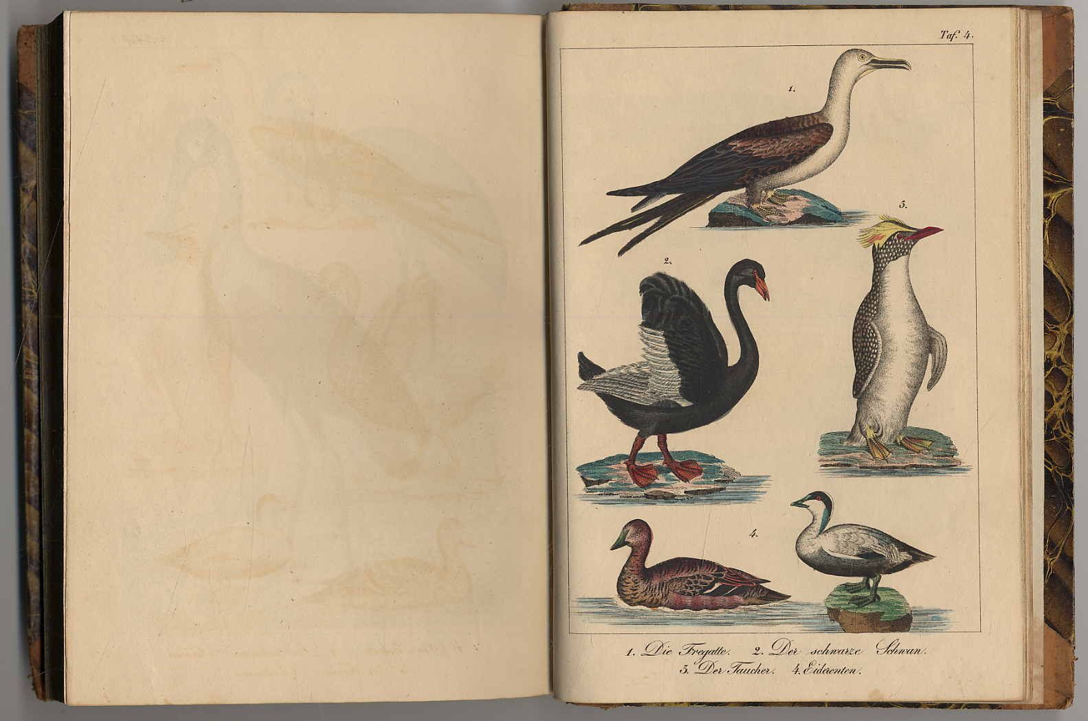 Zimmermann, W. F. A. (d.i. Carl Gottfried Wilhelm Vollmer) (Hrsg.): Das Meer, seine Bewohner und seine Wunder. Seitenstück zu K. F. V. Hoffmann’s Erde und ihre Bewohner. 2 Bände. Stuttgart, Julius Weise, 1837. Ca. 19,5 x 14 cm. 407 Seiten, mit Stahlstich-Fronispiz, gestochenem Titelblatt und 3 lithographierten Tafeln, 380 Seiten, mit 10 lithographierten Tafeln (davon 8 farbigen); Halblederbände der Zeit mjit Rückengoldprägung. Rücken und Kanten etwas bestoßen. Vorsätze an den Ecken leimschattig. Seiten teils gebräunt bzw. stockfleckig, die nicht colorierten Tafeln in Band 1 gebräunt. Hübsch colorierte Tafeln.