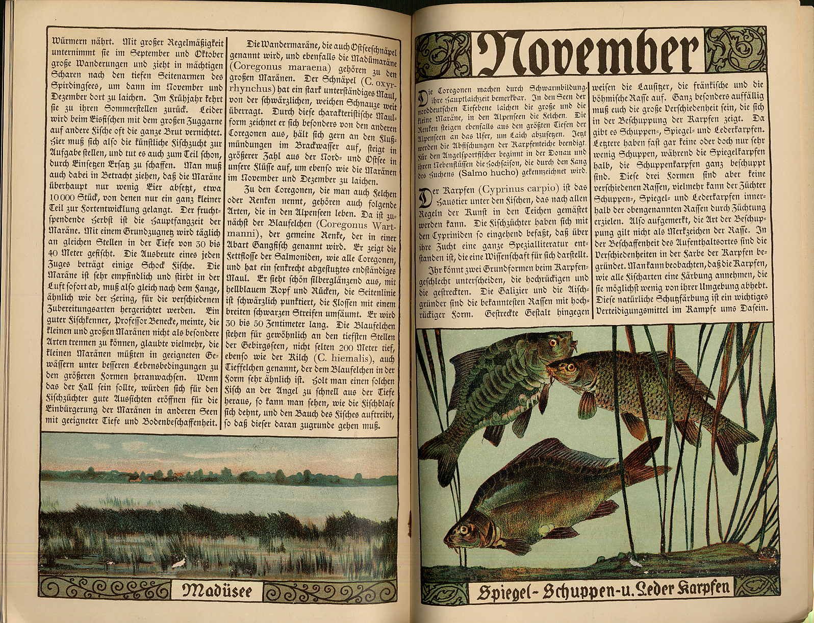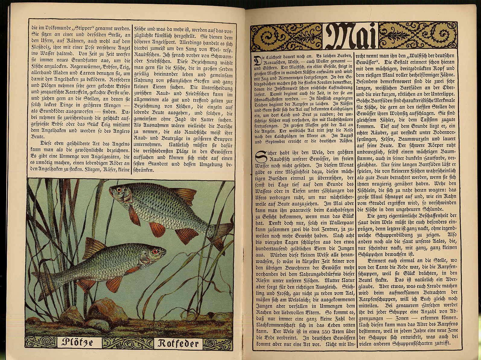 Fechner, Hanns und Carl Paeske: Fischkalender. 1. Teil: Fische unserer Flüsse und Seen. Leipzig, Fr. Wilh. Grunow, [1908]. Ca. 29 x 19,5 cm. (28 Seiten). Mit Farblithographien nach Zeichnungen von Berthold Clauß. Farbig illustrierter, lithographierter, ausgestanzerter Orig.-Halbleinenband. Originalhalbleinwandeinband mit ausgestanzten Teilen (Fisch, Seerosen) am Vorderdeckel. Einbandkanten minimal bestoßen, Hinterdeckel am unteren Rand etwas fleckig. Sehr dekorativer Kalender der zu jedem Monat eine Fischart mit ausführlicher Beschreibung zeigt. Gutes Exemplar.