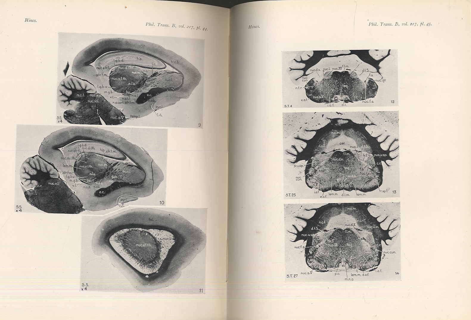 Hines, Marion: The brain of Ornithorhynchus anatinus. Sonderdruck aus: Philosophical Transcactions of the Royal Society of London, Serie B, Vol. 217 Seiten 1557-287, Plates 41-83. London, 1929. Ca. 30,5 x 23 cm. Mit 43 s/w Tafeln. Brauner originalkartonierter Einband. Rücken leicht bestoßen. Namenszug auf Einband und erster Seite. In englischer Sprache. Abhandlung über die Entwicklung des Gehirns des Schnabeltieres. Gutes Exemplar.