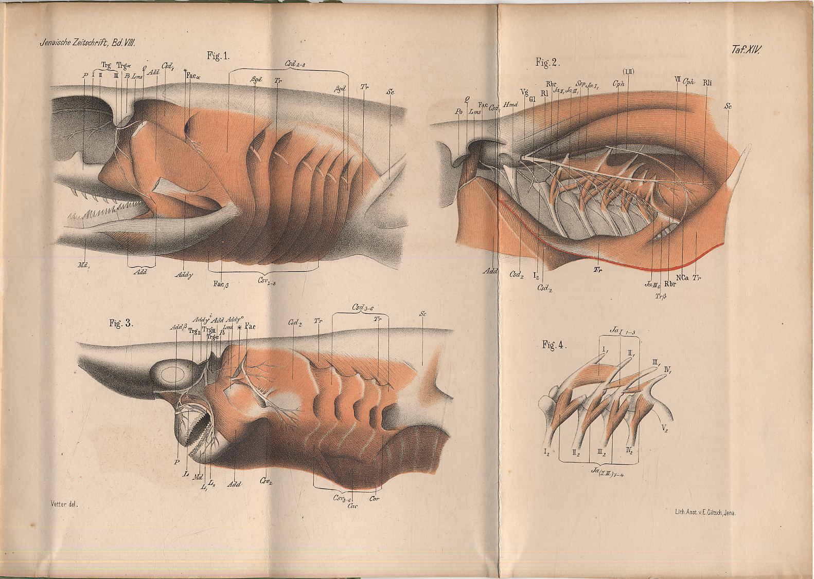 Vetter, Benjamin: Untersuchungen zur vergleichenden Anatomie der Kiemen- und Kiefernmusculatur der Fische. 1. und 2. Teil. 2 Bände. Beginnt mit Seite 405 – Seite 458, mit 2 mehrfach gefalteten farblithographierten Tafeln (Teil 1); Beginnt mit Seite 432 – Seite 550, mit 2 mehrfach gefalteten farbllithographierten Tafeln (Teil 2). Einfache Papierumschläge. Teil 1 Umschlag mit handschriftlichem Titel; Teil 2 Umschlag lose, Heft 2 in zwei Teile gebrochen. Unaufgeschnitten und unbeschnitten. Seiten teils stockfleckig. Sonderdruck, so komplett mit den vier Tafeln. Vetter (1848-1893, Zoologe), „war ein durch umfangreiches Wissen ausgezeichneter Naturforscher und einer der eifrigsten Anhänger Darwin’s“. (W. Heiß in ADB 39, S. 662 ff.).