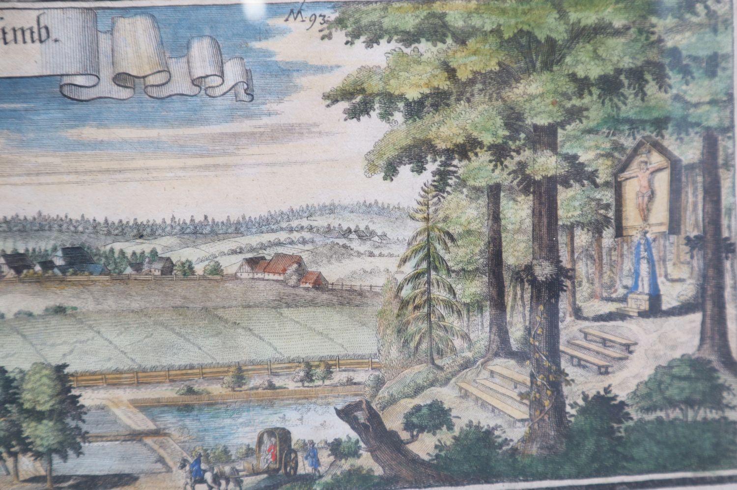 Pelheim b. Dachau – Schloß und HoffMarch Pelheimb. Colorierter Kupferstich von Michael Wening. Um 1750. Querformat, ca. 13 x 35 cm. Gerahmt, unter Glas. Sehr dekorativer Kupferstich mit alter Koloratur. Blick über angelegte Teiche auf das Schloss und den Ort Pelheim. Im Vordergrund eine Kutsche und rechts am Waldrand ein Wegkreuz mit Muttergottes-Statue.
