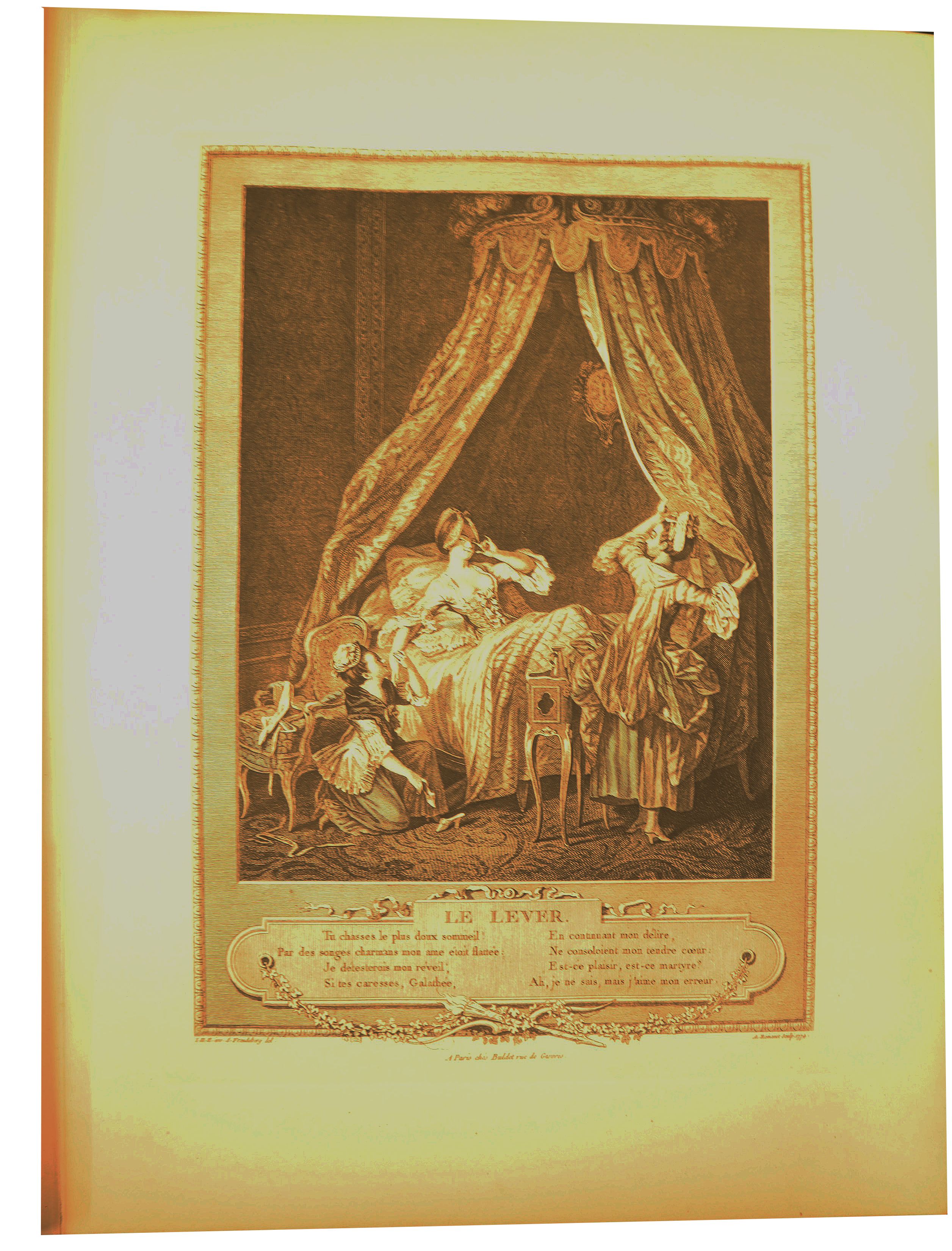 Freudenberger – Suite d’estampes pour servir à l’histoire des moeurs et du costume des François dans le dixhuitième siècle. Année 1774. Faksimile der Ausgabe Paris 1774. München, J.B. Obernetter, [1918]. Ca. 48,5 x 36,5 cm. (50) Seiten. Mit 12 Kupferstichtafeln von Sigmund Freudenberger. Orig.-Halblederband. Exemplar 130/165 auf feinstem Kupferdruckkarton gedruckt. Text in französisch. Sammlung von Kupferstichen, die anhand eines Tages das Alltagsleben der Damen, die Sitten und die Mode des 18. Jahrhunderts in Frankreich darstellen von der morgendlichen Toilette über gesellschaftliche Zusammenkünfte bis zum Zubettgehen. Rücken etwas berieben und bestoßen, Blätter am Falz teils etwas gelockert. Dekorative Abbildungen.