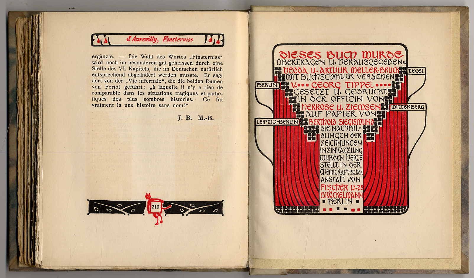 Barbey D’Aurevilly, [Jules Amédée]: Finsterniss. Übertragen und hrsgg. von Hedda u. Arthur Möller-Bruck. Berlin, Julius Bard, 1902. Ca. 16,5 x 14 cm. (4) S., 210 S., (2) Seiten. Buchschmuck von Georg Tippel. Halbpergamentband. Vorsätze erneuert. Auf Papier von Berthold Siegismund, die Nachbildungen der Zeichnungen in Zinkätzung hergestellt in der chemographischen Anstalt von Fischer u. Dr. Bröckelmann in Berlin. Mit reizendem Buchschmuck in rot und schwarz.