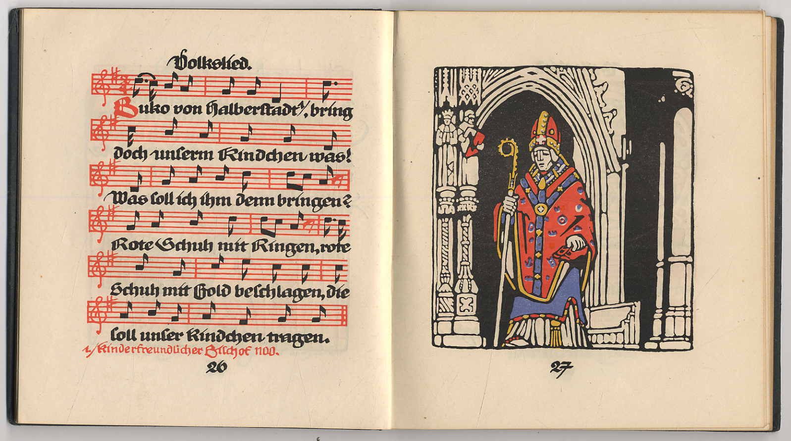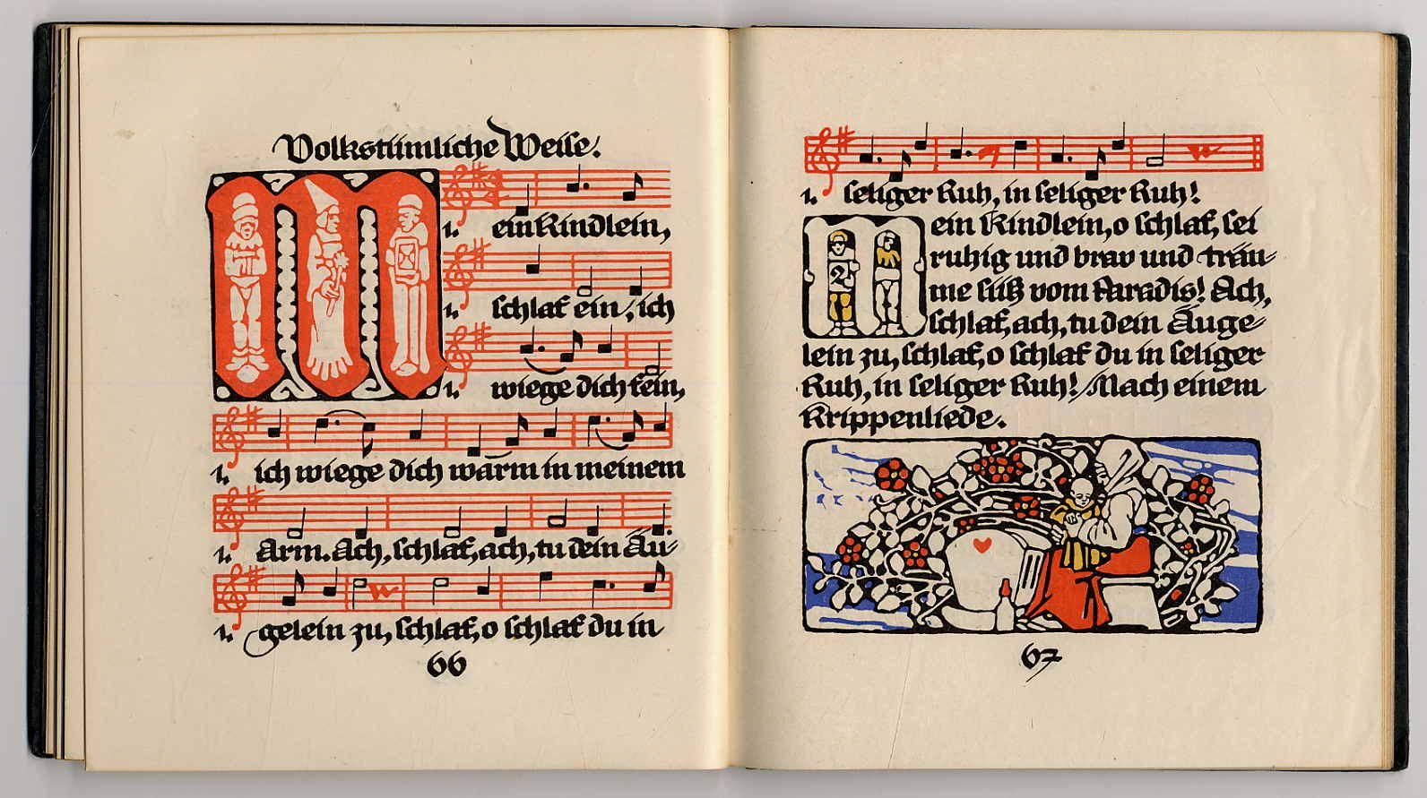 Deutsche Wiegenlieder. In Wort und Weise ausgewählt von Hans Fraungruber. Wien u. Leipzig, Gerlach & Wiedling, o.J., nach 1921. Ca. 15 x 14 cm. 95 Seiten. Mit farbigen Bildern und Schrift von R. Daenert. Illustrierter blauer Orig.-Leinenband mit Goldprägung. Aus der Reihe: Gerlachs Jugendbücherei, Band 24. Verlagssignet GW. Heller: Die bunte Welt 110R A (C): „Sicherlich einer der eigenwilligsten nd eindrucksvollsten Bände der Reihe. Das verdankt sich natürlich primär der konsequenten Gestaltung des Buch-Ganzen … Der Versuch das Büchlein wie ein handgeschriebenes Buch erscheinen zu lassen, erzeugt einen Charakter von erlesener Kostbarkeit.“ Auf dem Titel als „Gerlachs Jugendbücher“ bezeichnet. Vorsatz „Mauskäfer“: „Die Bezeichnung „Mauskäfer“ habe ich 1981 eingeführt … obwohl sie auf einer Bild-Mißinterpretation beruht: es handelt sich zweifellos um ein Chamäleon. Doch sollte, um neuerliche Verwirrung auszuschließen, der Mauskäfer weiter sein Leben fristen.“ (Friedrich C. Heller: Die bunte Welt, S. 116). Namenszug auf Titelbnlatt, sonst gutes Exemplar.