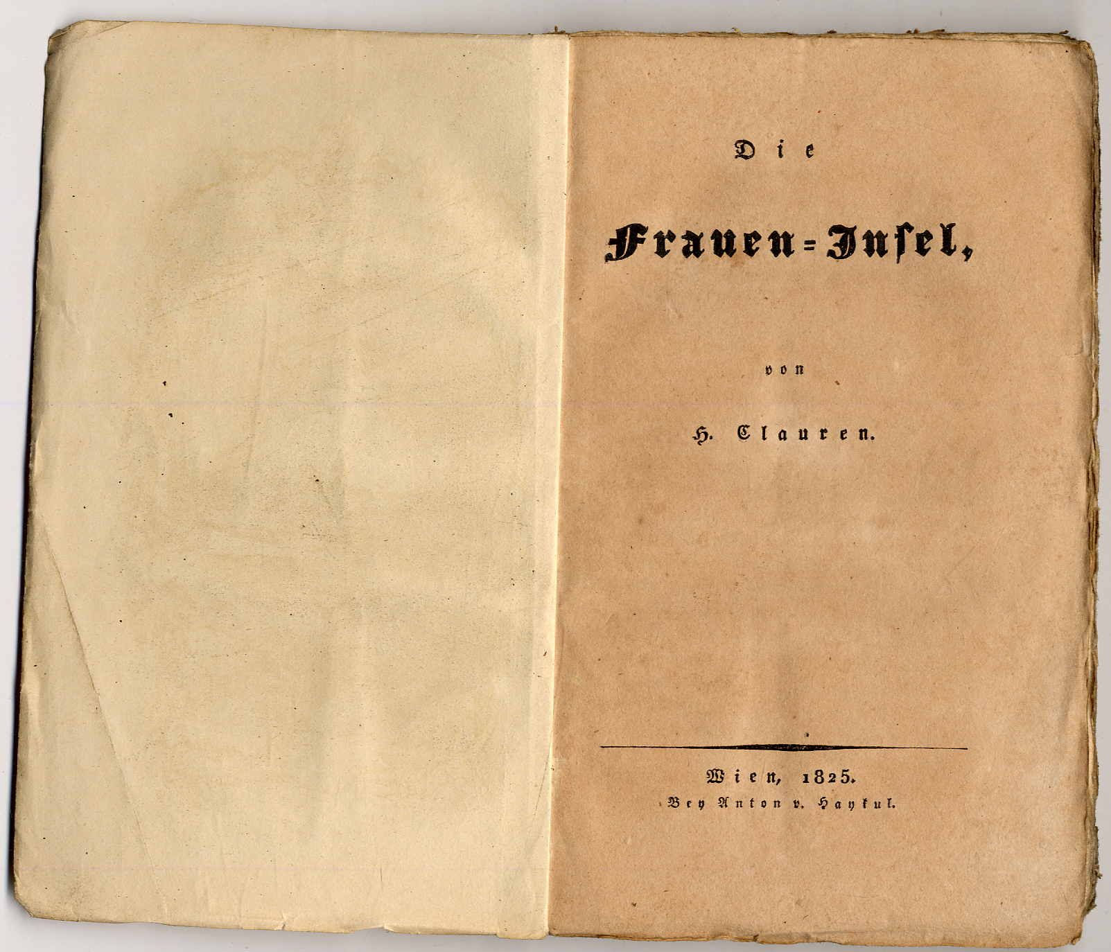 Clauren, H. (d.i. Johann Gottlieb Samuel Carl Heun Die Frauen-Insel. Wien, Anton v. Haykul, 1825. Ca. 17 x 11 cm. 164 Seiten. Illustrierte Originalbroschur. Aus der Reihe: Winterabende, Band 33. Breitrandiges, unbeschnittenes Exemplar. Titelblatt gebräunt. Reihennummer auf Rücken. Heun (1771-1854, Schrifsteller) verfasste leichte Erzählungen für lange Winterabende. In der illustrierten Originalbroschur.