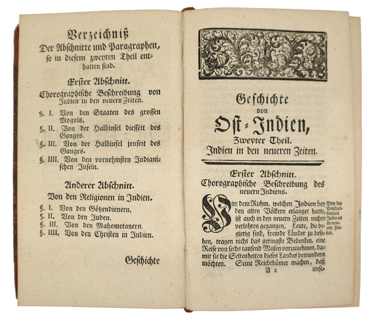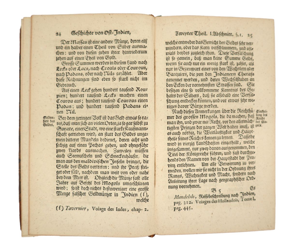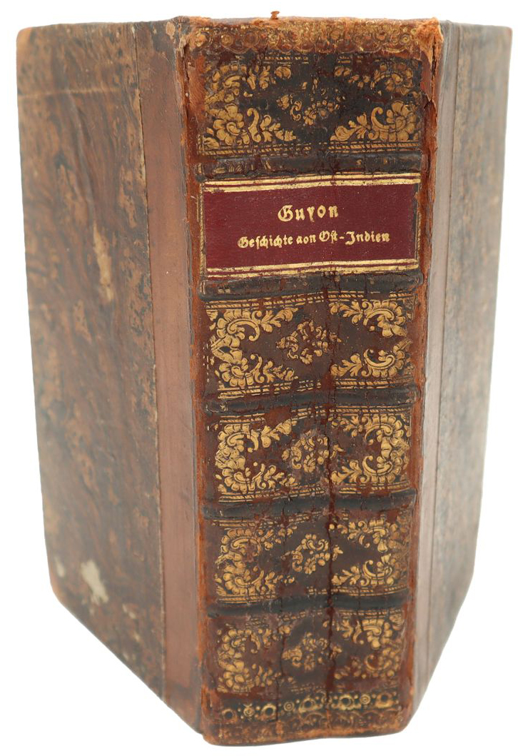 Guyon, [Claude Marie]: Des Abts Guyon Geschichte von Ost-Indien, Alter so wohl, als neuerer Zeiten. Drey Theile, aus dem Französischen übersetzt, mit einem dreyfachen vollständigen Register vermehret. 3 Teile in einem Band. Frankfurt und Leipzig, Johann Gottlieb Vierling, 1772. Ca. 18 x 10,5 cm. (24) S., 384 Seiten; 264 Seiten; 41 Seiten. Halblederband der Zeit mit Rückenschild und reicher Rückengoldprägung. Einband und Rücken etwas berieben. Der erste Teil enthält eine geographische Beschreibung von Indien, eine Beschreibung der Staatsverfassung, einen Überblick über die Tierwelt, die Handelsbeziehungen mit der Alten Welt und die Portugiesen, daneben eine Geschichte der Moguls. Der zweite Teil berichtet über die neueren Zeiten und gibt einen Überblick über die in Indien ausgeübten Religionen, während der dritte Teil im Mittelpunkt die Handelsbeziehungen der Portugiesen, Holländer, Engländer, Dänen und Venezianer mit Indien stellt. Ein gesonderter Abschnitt ist dem Handel der Franzosen mit Indien gewidmet. Der Autor war ein französischer Historiker und Geistlicher, er eine Reihe von Werken, meist geschichtlichen Inhalts, verfaßt hat.