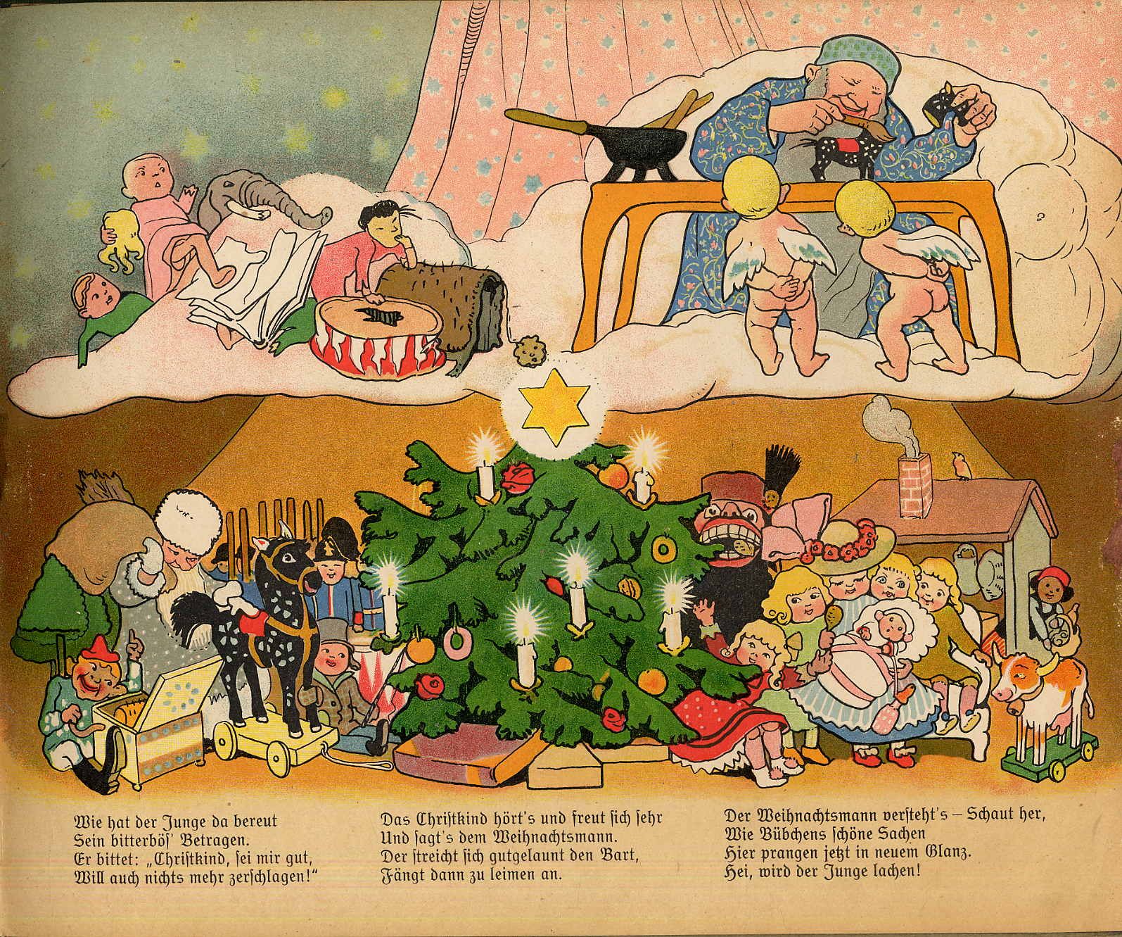 Steinkamp, Maria: Ihr Kinderlein kommet. Duisburg, J.A. Steinkamp, [1912]. Querformat, ca. 27 x 33 cm. (12) Seiten mit farbigen Illustrationen von Gertrud Pfeiffer-Kohrt. Farbig illustr. Orig.-Halbleinenband. Klotz 7064/1. Erste Auflage. Einbandkanten etwas bestoßen. Mit hübsch illustrierten Vorsätzen. Das Buch hat keinen religiösen Hintergrund. Die Bilder und Verse zu den Themen: Frühling: „Vogelmuter schützt die Brut, – Küchlein atmet Leben. – Kinder, pflegt die Gaben gut, – Die der Lenz gegeben.“; Die Sonne geht auf; Am Morgen; Krieg und Frieden; Munteres Spiel; Schlaf, Kindchen schlaf; Vom Samenkorn; Vom Jungen, der alles kaput macht: „Das Pferdchen hebt den dünnen Schwanz, – es möcht sein Leid wohl klagen. – Doch geht das nicht, der Nichtsnutz hat – Den Kopf ihm abgeschlagen“; Es kommt Besuch. Reich illustriert.