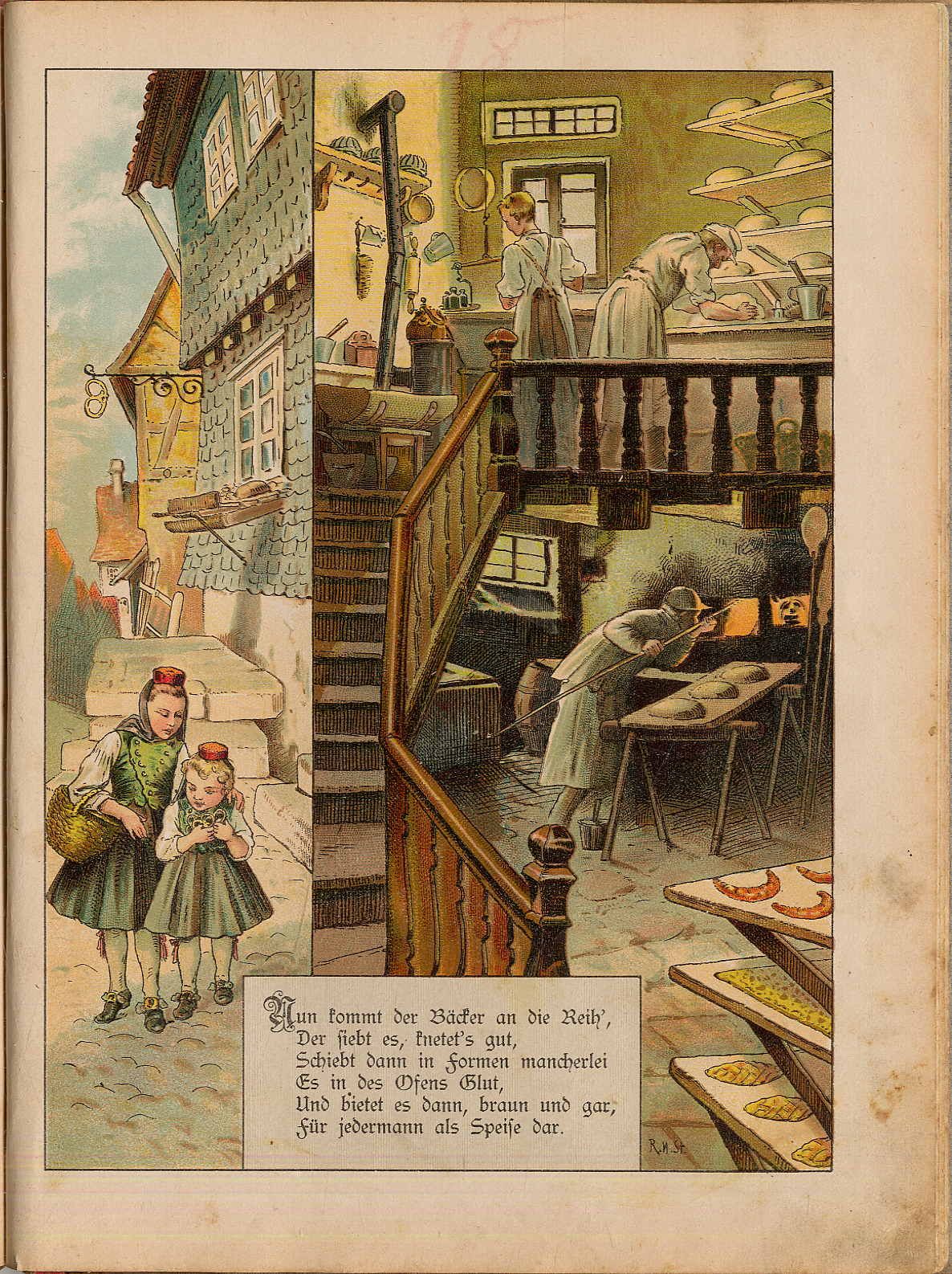 Steinkamp, A.: Woher kommt’s Brot? Bilder mit unterhaltendem Text fürs kleine Volk. Duisburg, J. A. Steinkamp, [1897]. Ca. 26,5 x 20,5 cm. (36) Seiten. Mit 12 großen farblithographierten Tafeln nach Originalzeichnungen von Robert Hermann Sterl. Farbig illustr. Orig.-Halbleinenband. Klotz 7062/4. Neuauflage 1897 des zuerst 1893 bei Lucas erschienen Titels. Einbandkanten etwas bestoßen. Einband und Seitenränder und hinteres Vorsatzblatt fleckig. Hinterdeckel mit neuem Papierüberzug. Kleine Gedichte und Erzählungen rund um’s Brot. Hübsche Illustrationen mit vielen Details.