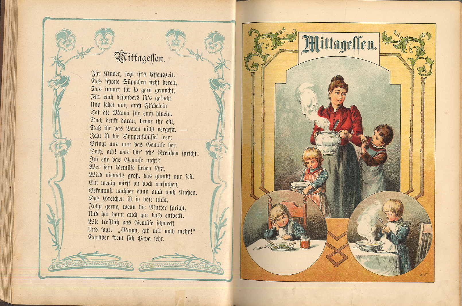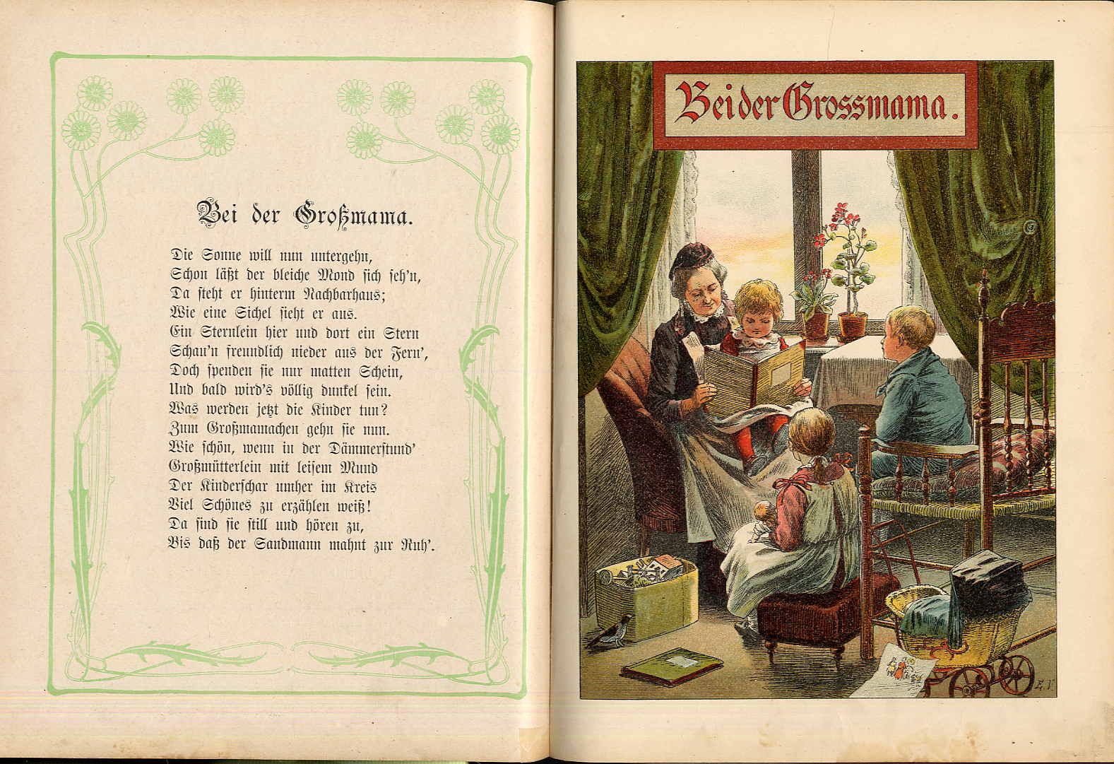 Steinkamp, A.: Grüß Gott! Vom Morgenrot bis Abendschein – Ein Buch für unsre Kinderlein. [Duisburg, J.A. Steinkamp, 1902]. Ca. 29 x 22,5 cm. (66) Seiten. Mit 16 farblithographierten Tafeln und Textillustrationen von Elisabeth Voigt. Farbig illustr. Orig.-Halbleinenband. Klotz 7062/10; Ries 946,42; nicht bei Bunk. Hinterdeckel und Vorsätze erneuert. Seitenränder leicht fingerfleckig. Hübsches Exemplar mit Versen und detailreichen Illustrationen u.a. zu Guten Morgen, Papa!; Frühstück; Der Gang zur Schule; Mittagsschläfchen; Schützenfest; Vesperzeit; Bei der Grossmama; Abend.