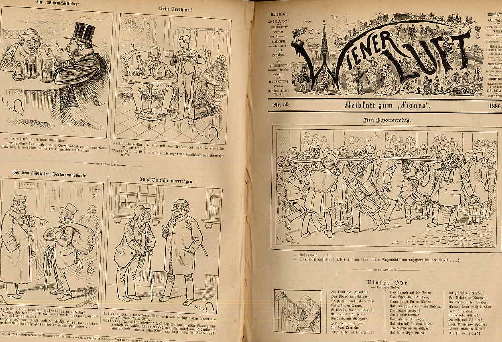 Anzengruber, Ludwig (Redakt.): Wiener Luft. Beiblatt zum Figaro. 1886 Hefte 1-52; 1887 Hefte 1-53 (ohne Hefte 14 und 39); 1888 Hefte 1-52 (ohne Hefte 15); 1889 Hefte 1-52 (ohne Hefte 2 und 50). 204 Hefte in einem Band. Wien, R. v. Waldheim, 1886-1889. Ca. 32 x 25 cm. Je Heft 4 Seiten, überaus reich illustriert. Halbleinenband. Heft 42 (1887) mit größerem Eckabriss. Seiten papierbedingt etwas gebräunt, einige Blätte rmit kleineren Randeinrissen und etwas fleckig, jedoch gutes Exemplar. Die „Wiener Luft“ enthält Witze, Anekdoten, Gedichte, Glossen und Karikaturen, die das Wiener Leben, die Politik und die Gesellschaft auf humorvolle Weise kommentierten. Typisch waren der Wiener Dialekt und viel Lokalkolorit.