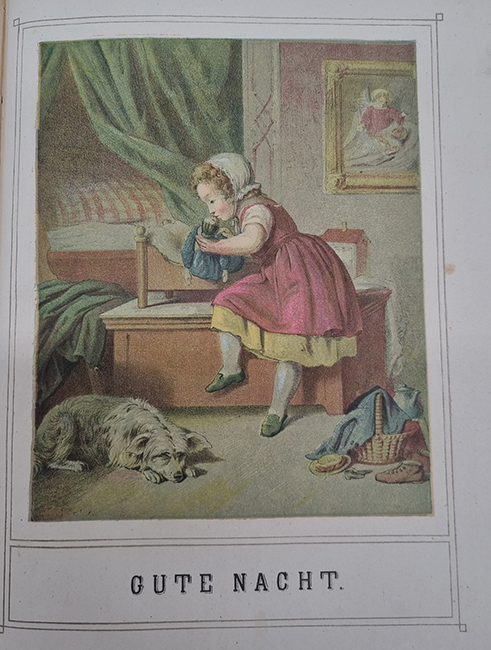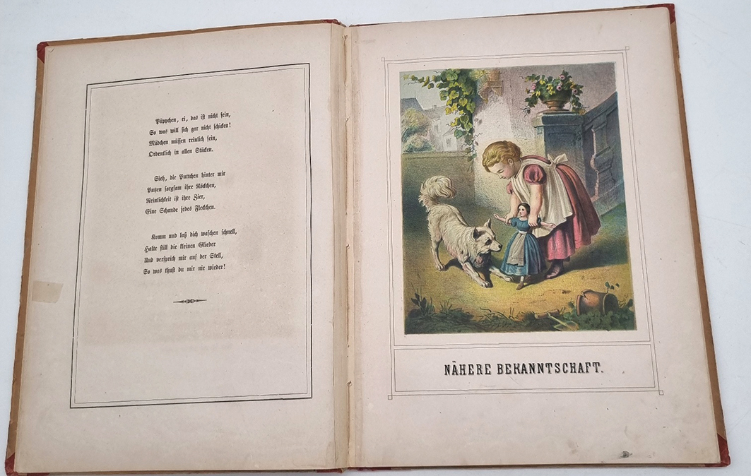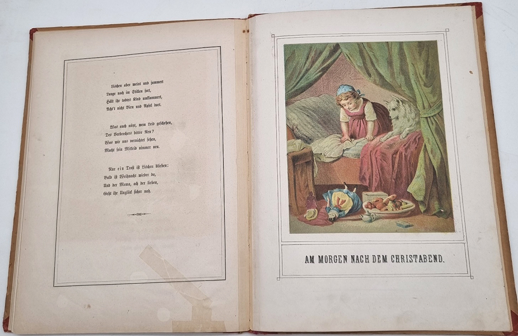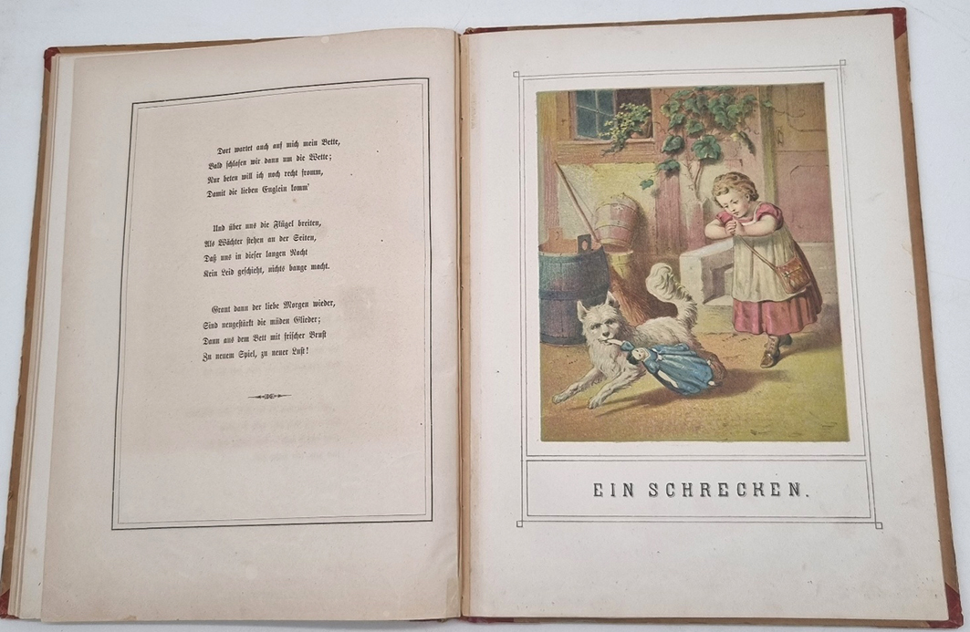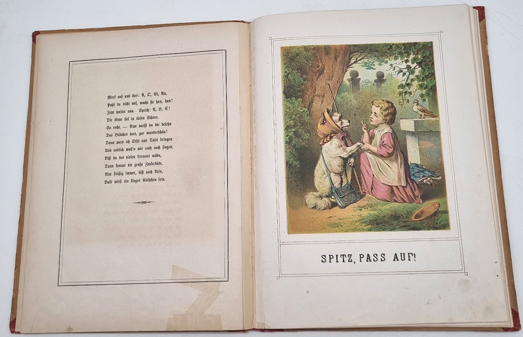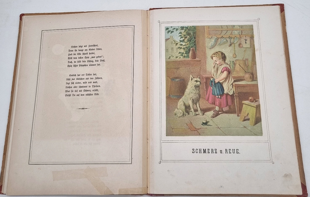 Wiedemann, Franz: Drei gute Freunde. Zwölf allerliebste Bilder aus dem Kindesleben. Zweite Auflage. Leipzig, Alfred Oehmigke, [1873]. Ca. 28,5 x 21,5 cm. (52) Seiten, mit farblithographiertem Titel sowie 12 ganzseitigen Farblithographien von Johann Baptist Sonderland. Farbig illustr. Orig.-Halbleinenband. Ries 889,2. Einband gebräunt und etwas fleckig, Kanten bestoßen. Seitenränder etwas fingerfleckig, kleinere Randeinrisse sauber hinterlegt. Die drei Freunde sind ein kleines Mädchen, Spitz der Hund und ein Püppchen im blauen Kleid.
