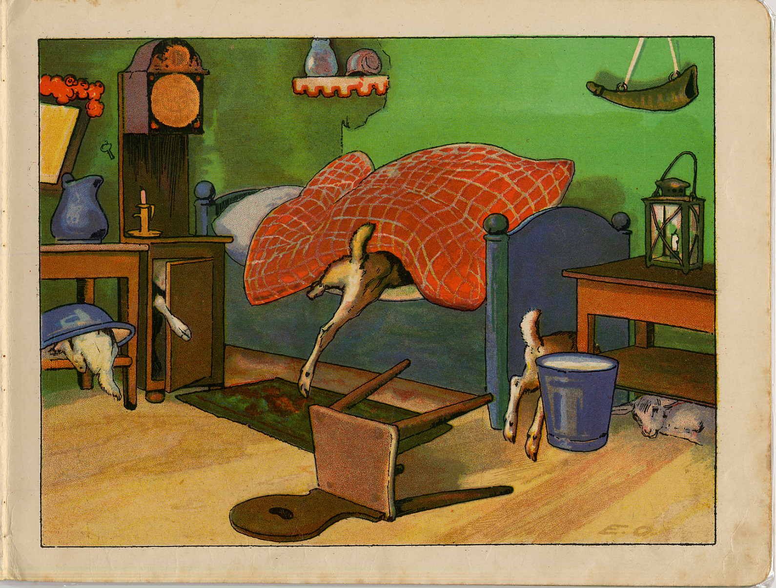 Grimm – Der Wolf und die sieben jungen Geisslein. Mainz, Verlag Jos. Scholz, [1928]. Querformat, ca. 22 x 29 cm. (16) Seiten. Mit illustriertem Titelblatt, zahlreichen Textillustrationen und 8 farbigen ganzseitigen Farbbildern von Eugen Osswald.. Illustr. Original-Halbleinenband. Aus der Reihe: Scholz’ Künstler-Bilderbücher Nr. 10a. Buchblock leicht gelockert. Namenszug auf Titelblatt. Ränder etwas braunfleckig. Ausgabe in Antiqua. „… gehören mit zum Besten seines Oeuvres.“ (vgl. Ries/Scholz S. 126 ff zu Eugen Osswald und dieser Ausgabe).