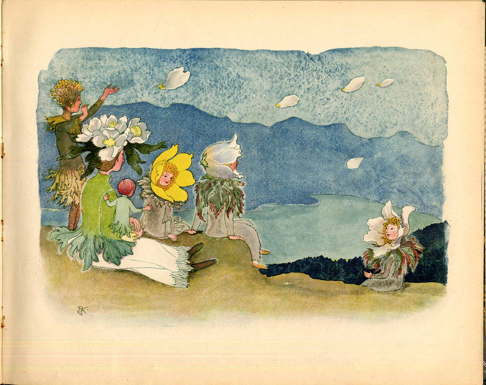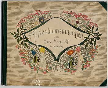 Kreidolf, Ernst: Alpenblumenmärchen. Erlenbach-Zürich u. Leipzig, Rotapfelverlag, [1922]. Querformat, ca. 26 x 32 cm. (40) Seiten mit 19 (davon 18 ganzseitigen) farbigen Illustrationen von Ernst Kreidolf. Farbig illustr. Orig.-Halbleinenband. Hess/Wachter A7. „… Heute wie damals liegt ein wundersamer Zauber in Kreidolfs Märchenbildern. … Sicher heben sich seine vermenschlichten Blumen-, Falter- und Grashupferfantasien von der konventionellen Illustration ab.“ (Hess/Wachter S. 6). Achtzehn Gedichte, die Bilder hierzu auf der jeweils gegenüberliegenden Seite. Mit hübsch illustrierten Vorsätzen. Einband minimal berieben, gutes Exemplar.