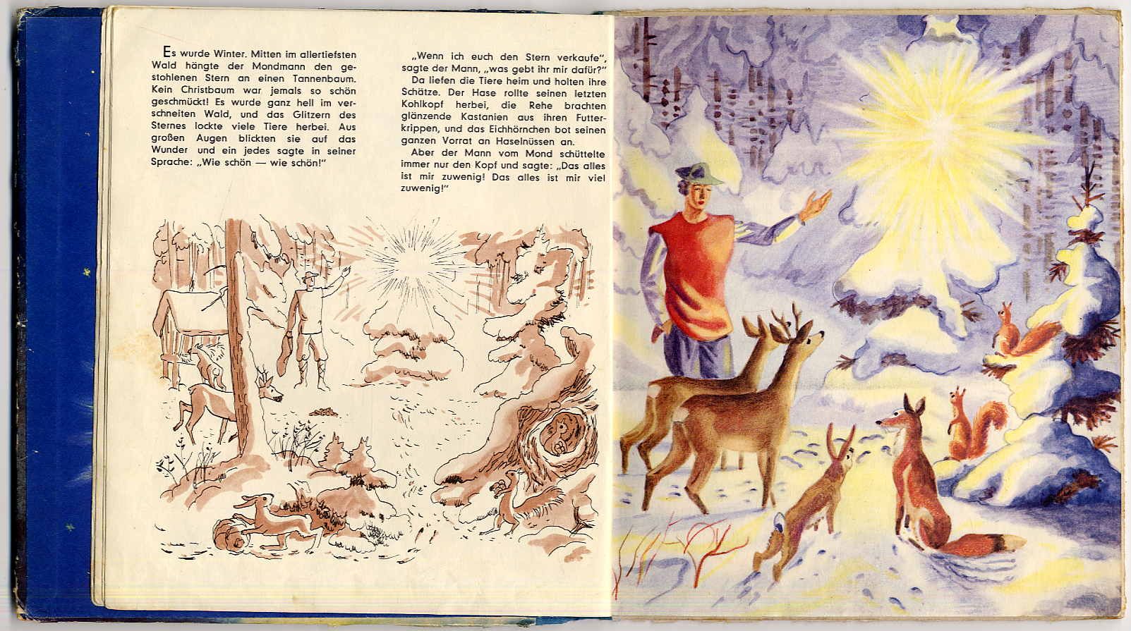 Umlauf-Lamatsch, Annelies: Der gestohlene Stern. Ein Märchen. Wien, Buchgemeinschaft Jung-Donauland, [1955]. Ca. 29 x 21 cm. (26) Seiten. Mit Illustrationen von Walter Dell, darunter 12 ganzseitigen farbigen. Farbig illustr. Orig.-Halbleinenband. Einbandkanten etwas berieben, Hinterdeckel leicht fleckig. Seiten teils leicht fingerfleckig.