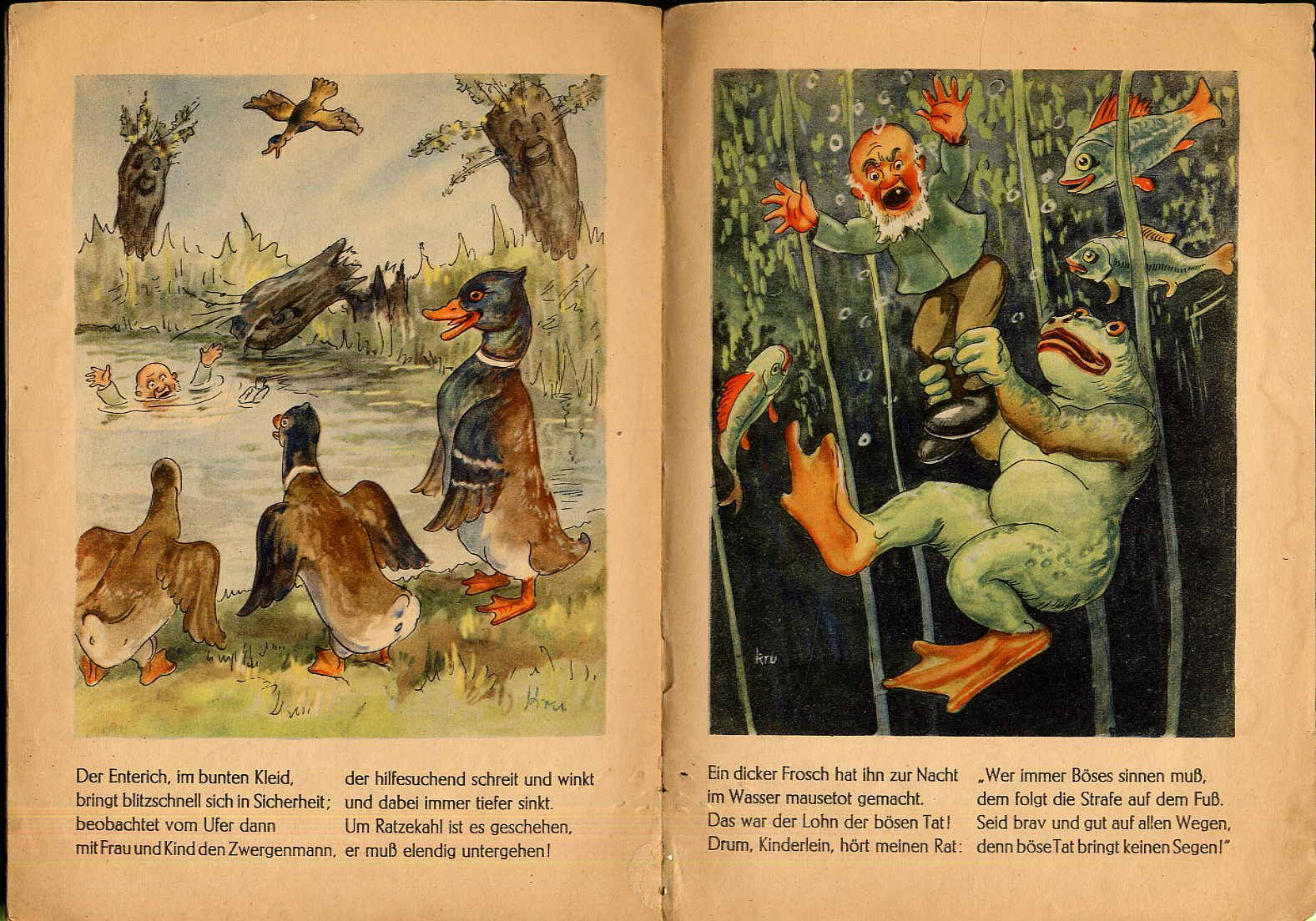 Karich, Margarete: Zwerg Ratzekahl. Berlin-Wedding, Karl Germer Verlag, 1948. Ca. 29,5 x 21 cm. (12) Seiten. Mit farbigen Bildern. Farbig illustr. Orig.-Broschur. Einbandrücken und -kanten bestoßen. Etwas gebräunt. In Form einer Struwwelpetriade. „Ein dicker Frosch hat ihn zur Nacht – im Wasser mausetot gemacht. – Das war der Lohn der bösen Tat! – Drum, Kinderlein, hört meinen Rat: – Wer immer böses sinnen muß – dem folgt die Strafe auf dem Fuß. – Seid brav und gut auf allen Wegen – denn böse Tat bringt keinen Segen!“.