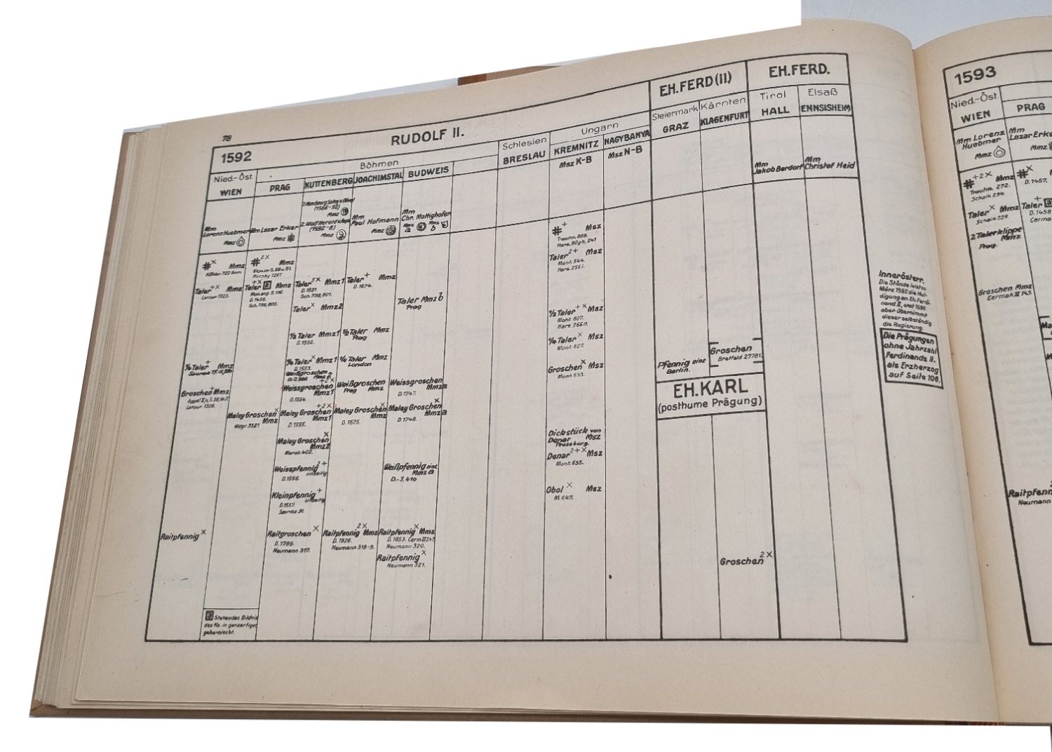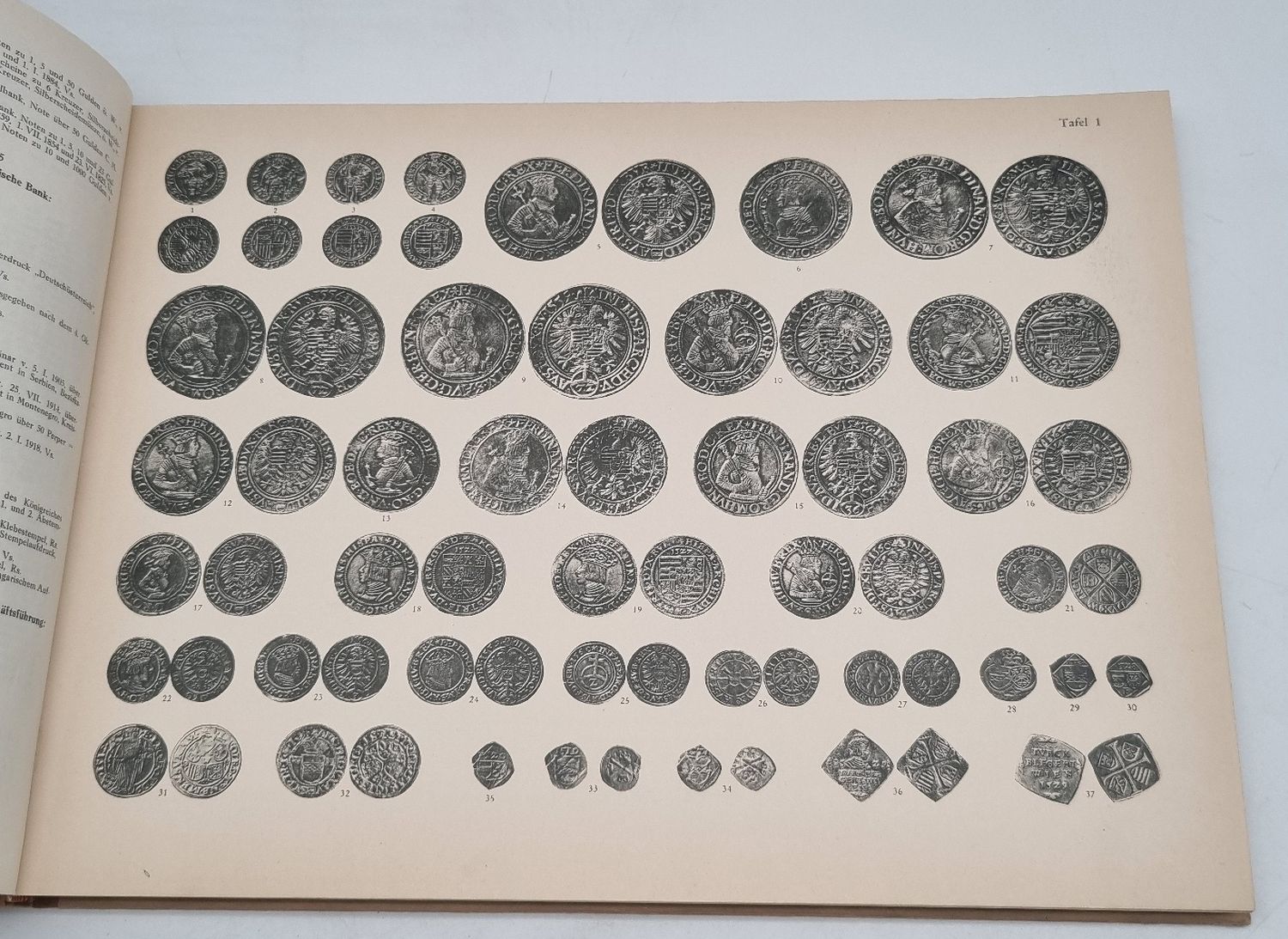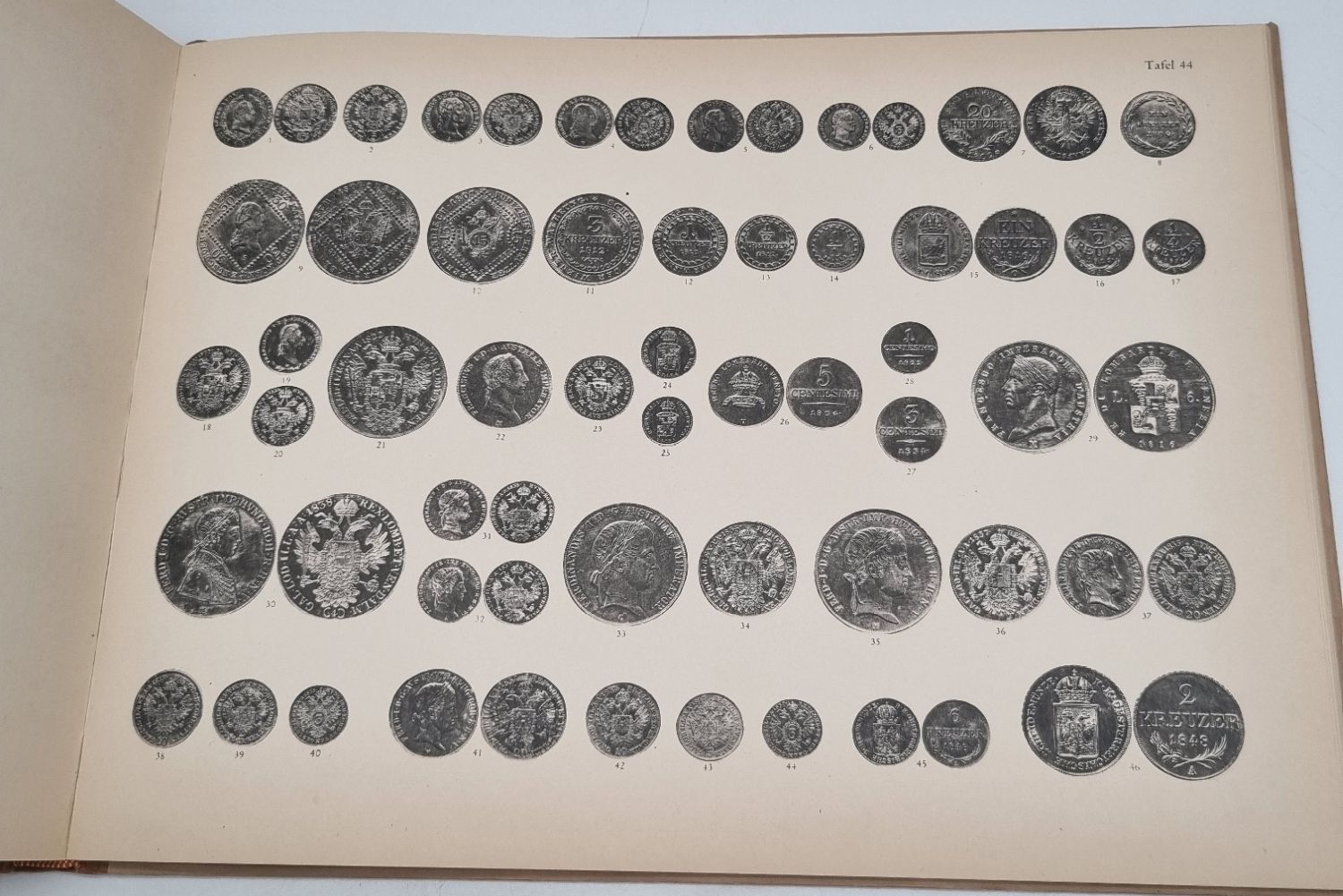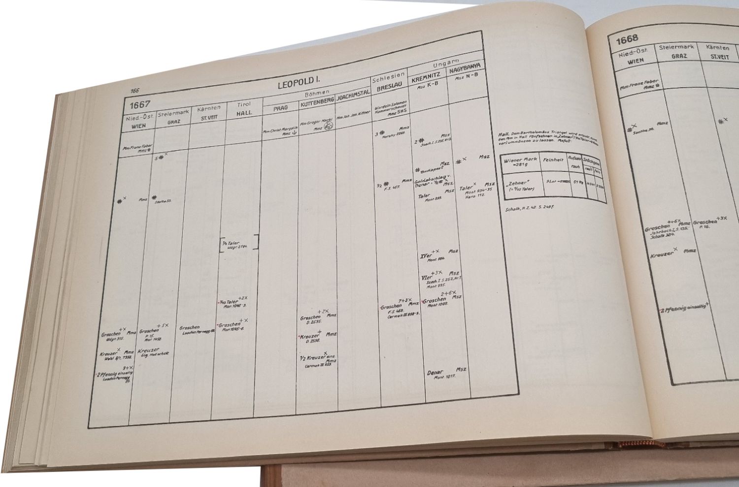 Miller zu Aichholz, V[iktor], A. Loehr und E. Holzmair (Bearb.): Österreichische Münzprägungen 1519-1938. Text- und Tafelband. 2. Auflage. 2 Bände. Wien, Verlag Bundessammlung von Medaillen, Münzen und Geldzeichen, 1948. Querformat, ca. 27,5 x 37,5 cm. XL S., 354 Seiten; 14 Seiten, 56 Tafelseiten mit zahlreichen Abbildungen. Orig.-Halbleinenbände. Beigefügt: Mitteilungen der Österr. Numismatischen Gesellschaft, Heft 10, 1954 mit den „Nachträgen und Berichtigungen zu den Österr. Münzprägungen 1519-1938“ von Eduard Holzmair (4) Seiten + ein Blatt Illustrationen. Sehr gutes Exemplar.