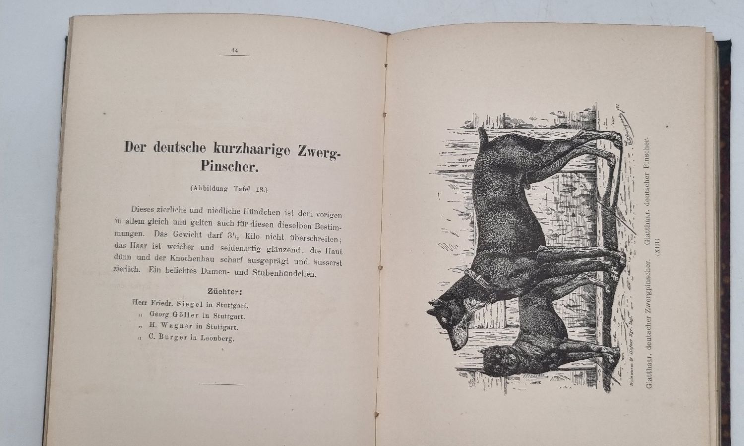 Bungartz, Jean (Hrsg.): Kynos, Handbuch zur Beurtheilung der Racen-Reinheit des Hundes. Angabe der bekanntesten Züchter. Capitel über Aufzucht. Pflege und die am meisten vorkommenden Krankheiten des Hundes. Stuttgart, Paul Neff Verlag, 1884. Ca. 20,5 x 14,5 cm. XIV S., 152 Seiten. Mit 35 Tafeln mit 70 Abbildungen nach der Natur gezeichnet von Jean Bungartz. Halbleinenband der Zeit. Exlibris auf Innendeckel und Bibliotheksstempel auf Titelblatt. Beschreibt 34 Hunderassen. Gutes Exemplar.