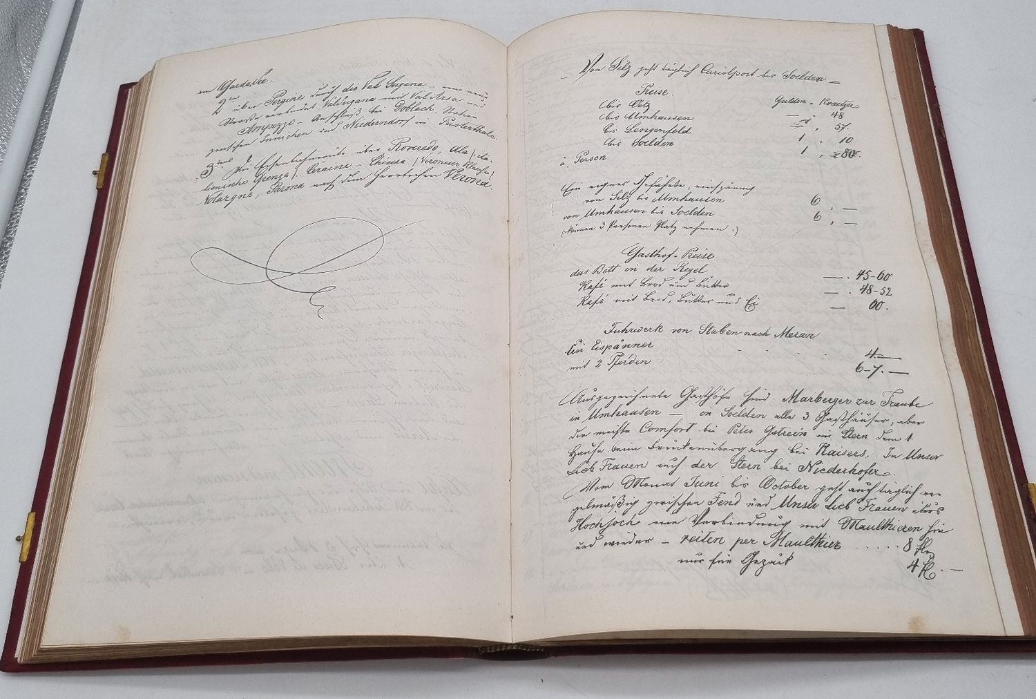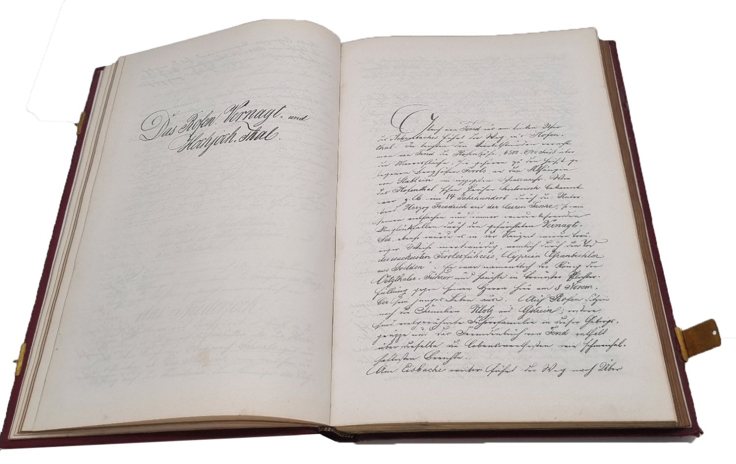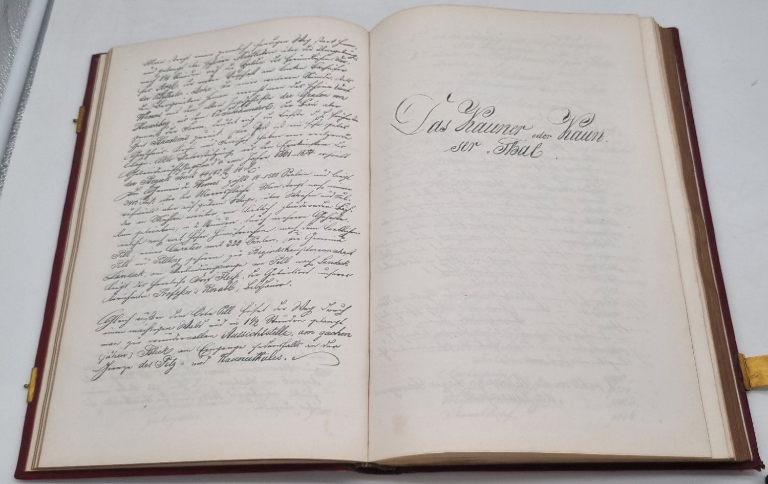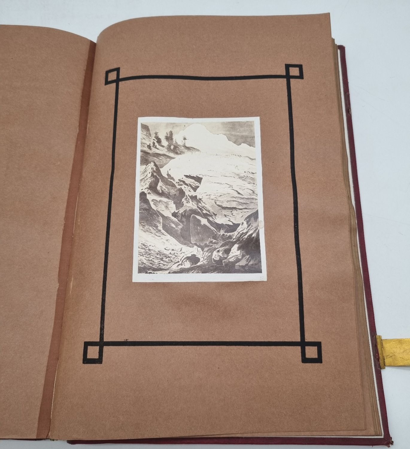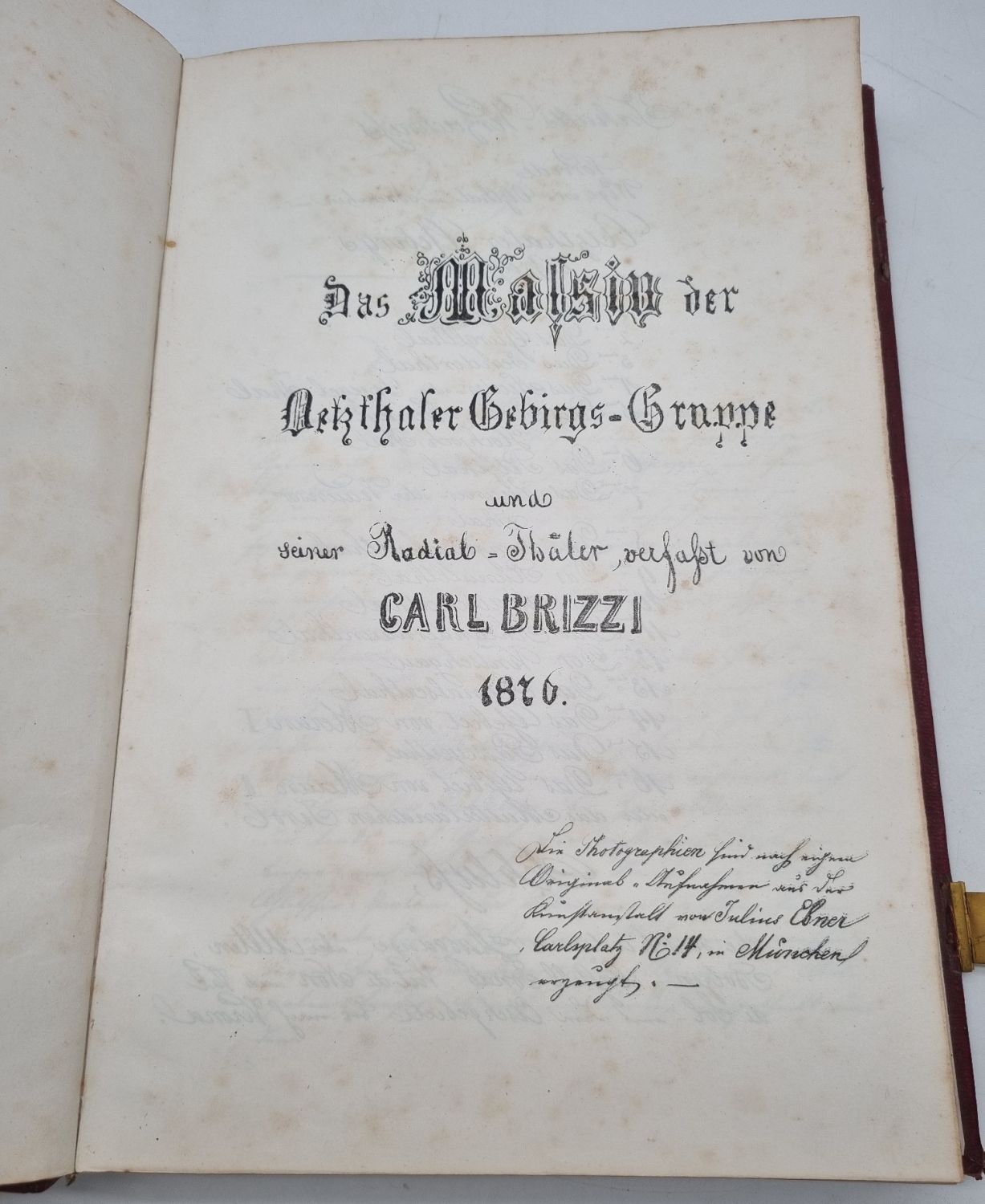 Brizzi, Carl: Das Massiv der Oetzthaler Gebirgs-Gruppe und seiner Radial-Thäler. Lithographierte Manuskript-Handschrift. 1876. Ca. 36 x 23,5 cm. Nicht paginiert, [271] Seiten. Mit 48 montierten s/w-Fotografien (davon 4 mehrfach gefaltete Bergpanoramen). Roter Original-Ledereinband mit zwei Schließen (nur noch eine vorhanden). Die Fotografien (erstellt von der Kunstanstalt Julius Ebner) geben die Aquarelle Brizzis wieder. Karl August Anton Ludwig Brizzi (1822-1878, deutscher Landschaftsmaler) wurde durch seine Aquarelle des Ötz- und Schnalstals bekannt. Seine geplante Veröffentlichung seiner Wanderungen und Bergbesteigungen, überwiegend als physio-geographische Abhandlung ausgeführt, ist nur als Manuskript mit seinen eingefügten Aquarellen erhalten geblieben (das Originalmanuskript ist Bestand des Archivs des ÖAV Museums). Bei seinen Erläuterungen und Daten bediente er sich auch aus den Werken von Karl Sonklar und den Gebrüdern Schlagintweit. Das hier vorliegende lithographierte Manuskript ist wohl nur in wenigen Exemplaren erschienen und sehr selten. Handschriftliche private Geschenkwidmung auf Vorsatz, datiert 1882.