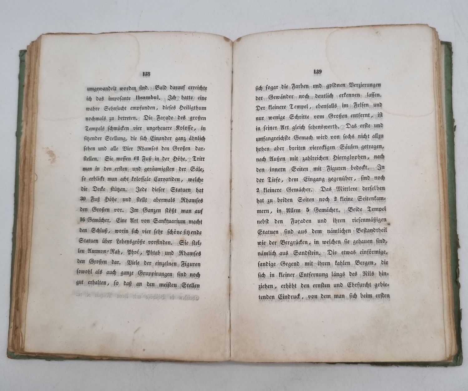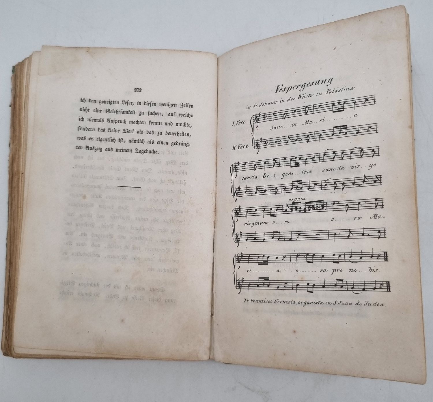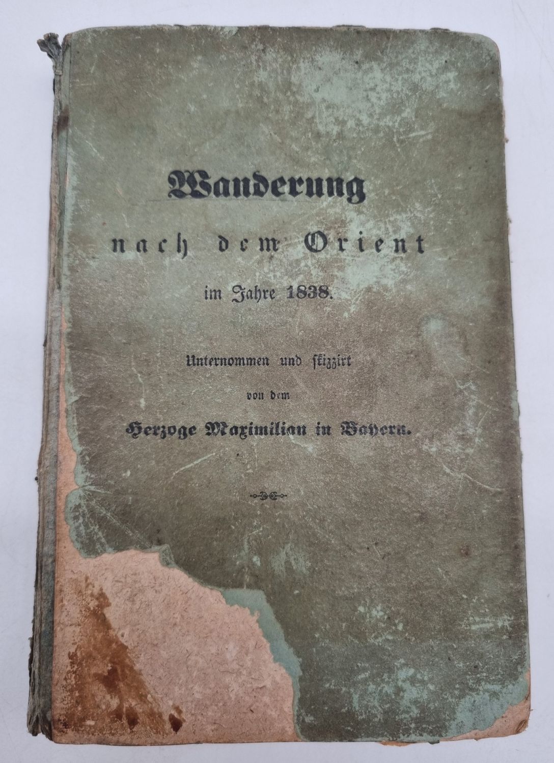 Maximilian in Bayern: Wanderung nach dem Orient im Jahre 1838. Unternommen und skizzirt vom Herzoge Maximilian in Bayern. München, Georg Franz, 1839. Ca. 17,5 x 11,5 cm. (6) S., 272 S., (6) Seiten. Mit einem lithographiertem Porträt-Frontispiz sowie einer lithographierten Notentafel. Orig.-Pappband. 1. Auflage. Einband beschädigt, bestoßen, es fehlt ein Teil des Überzugspapiers. Buchblock gelockert, daher einige Seiten locker. Breitrandiges, unbeschnittenes Exemplar, Seiten teils stock- bzw. fingerfleckig. Mit den vier Seiten Verlagsanzeigen am Schluss. Bereist wurden Ägypten, Nubien, Palästina, Syrien und Malta.