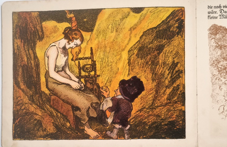 Grimm – Rumpelstilzchen. Scholz’ Künstler-Bilderbücher Nr. 21. Mainz, Jos. Scholz, [1929]. Ca. 22 x 28,5 cm. (16) Seiten mit farbig illustriertem Titelblatt, Textillustrationen und 8 ganzseitigen farbigen Bildern (Algraphien) von Ernst Liebermann. Farbig illustr. Orig.-Halbleinenband. Erste Ausgabe. Ries 864,2; Ries „Das deutsche Bilderbuch“ S. 126 ff. Vorderdeckel: Vertikale Leisten mit Zauberer, Krone, Vogel und Farbillustration. Vorsatz Blumenkörbchen. Einbandkanten etwas bestoßen. Namenszug auf Titelblatt. Seitenränder leicht fingerfleckig. „Ein so unermüdlicher Illustrator wie Ernst Liebermann (1869-1960), der sich über Jahrzehnte hin treu blieb und mit seiner Lithographenhandschrift Landschaftspoesie ebenso wie eine gekonnte figürliche Gestaltung beherrschte, durfte in dieser Reihe nicht fehlen.“ (Hans Ries, Schiefertafel 1980, S. 126 ff).