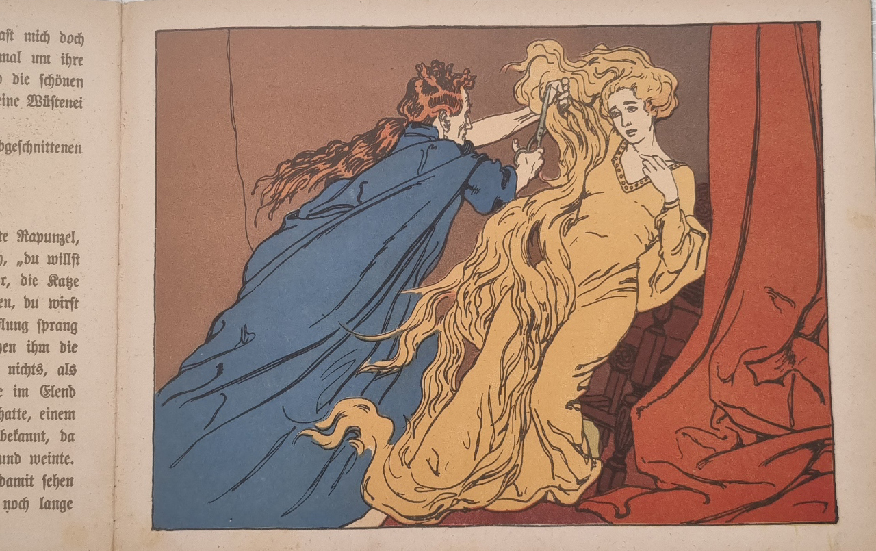 Grimm – Rapunzel Scholz’ Künstler-Bilderbücher Nr. 17. Mainz, Jos. Scholz, ca. 1925. Ca. 22 x 28,5 cm. (16) Seiten mit farbig illustriertem Titelblatt, Textillustrationen und 8 ganzseitigen farbigen Bildern (Algraphien) von Ernst Liebermann. Farbig illustr. Orig.-Halbleinenband. Erste Ausgabe. Ries 864,2; Ries „Das deutsche Bilderbuch“ S. 126 ff. Vorderdeckel: Vertikale Leisten mit Zauberer, Krone, Vogel und Farbillustration. Vorsatz Blumenkörbchen. Einbandkanten etwas bestoßen. „Ein so unermüdlicher Illustrator wie Ernst Liebermann (1869-1960), der sich über Jahrzehnte hin treu blieb und mit seiner Lithographenhandschrift Landschaftspoesie ebenso wie eine gekonnte figürliche Gestaltung beherrschte, durfte in dieser Reihe nicht fehlen.“ (Hans Ries, Schiefertafel 1980, S. 126 ff).