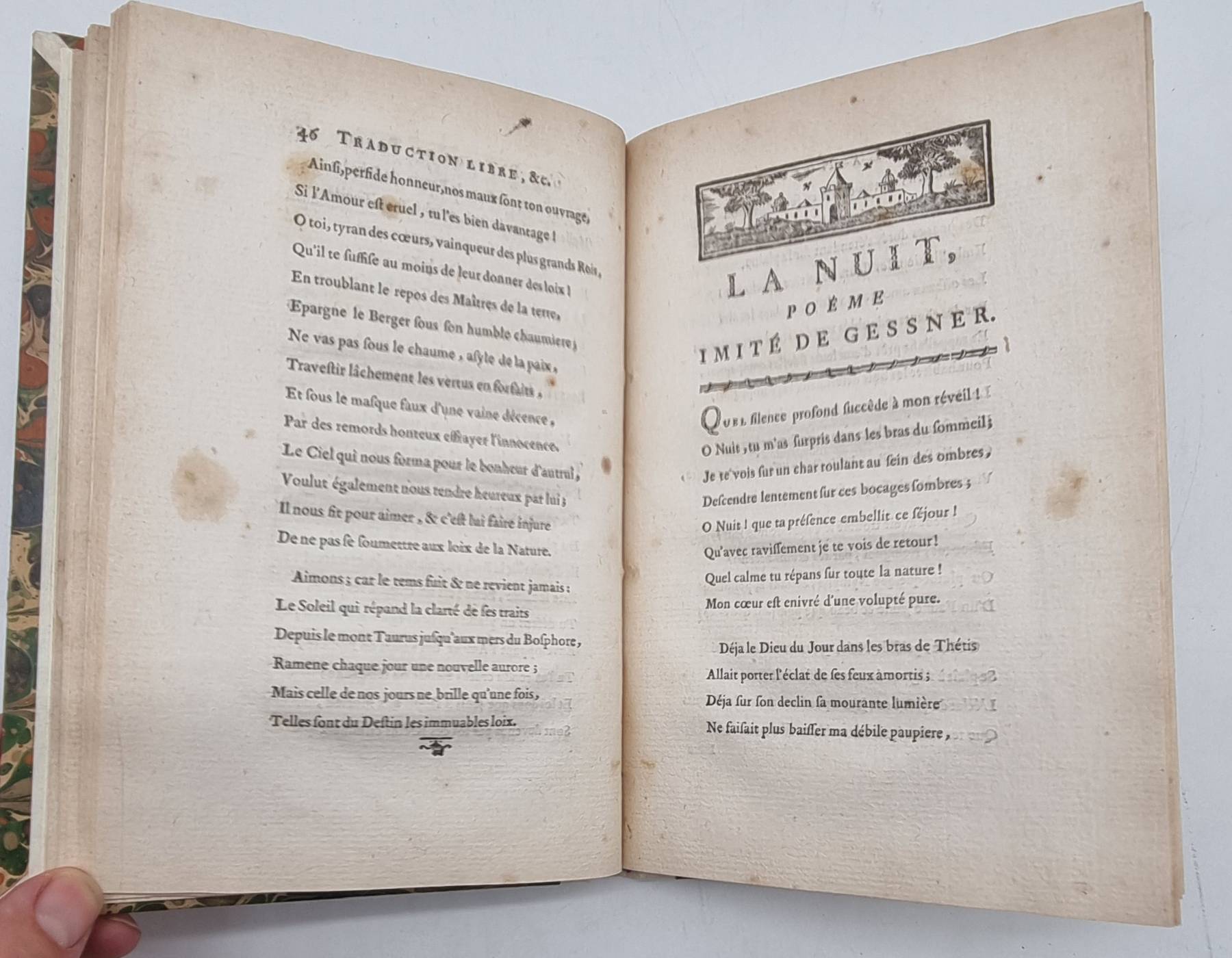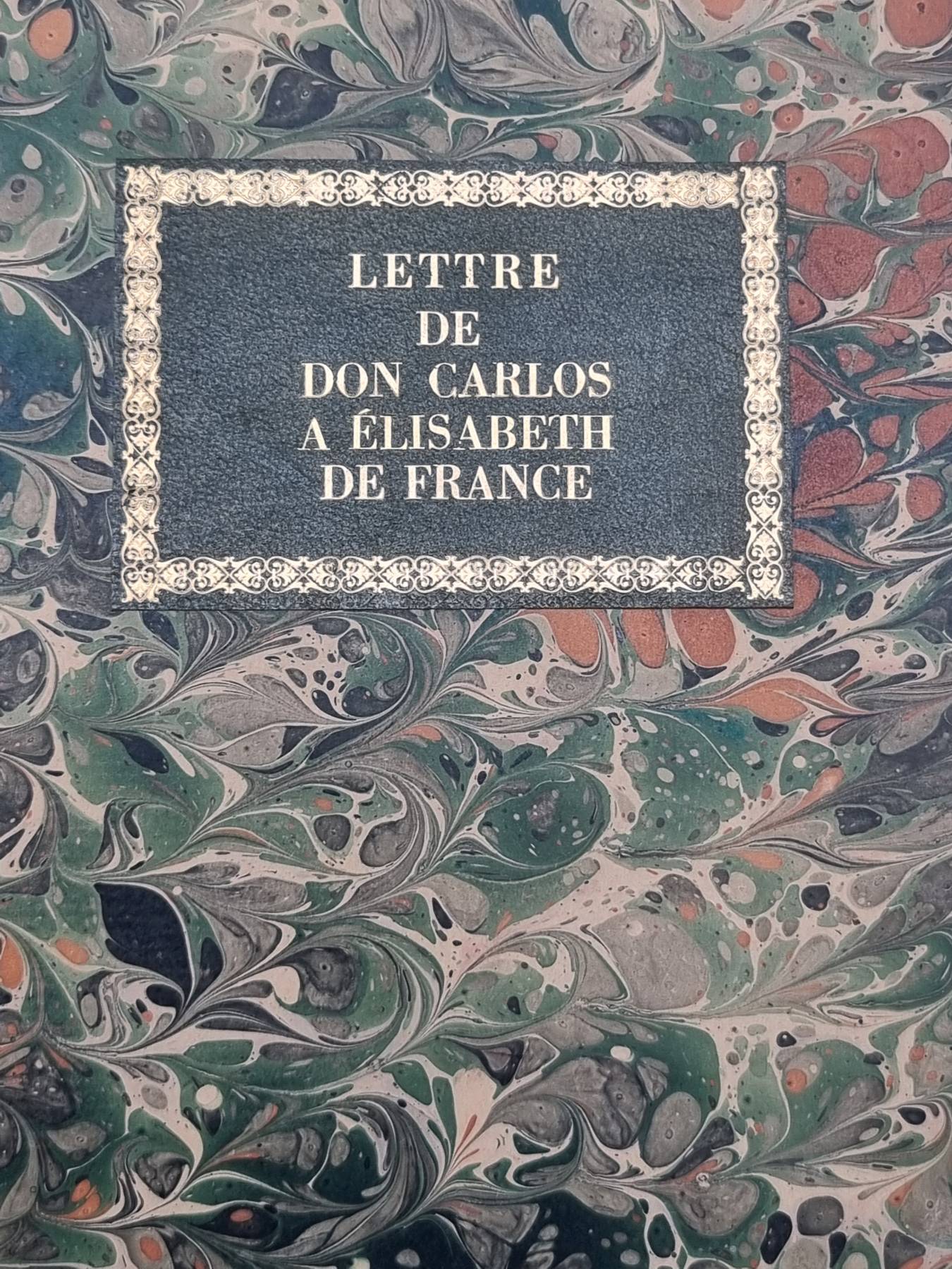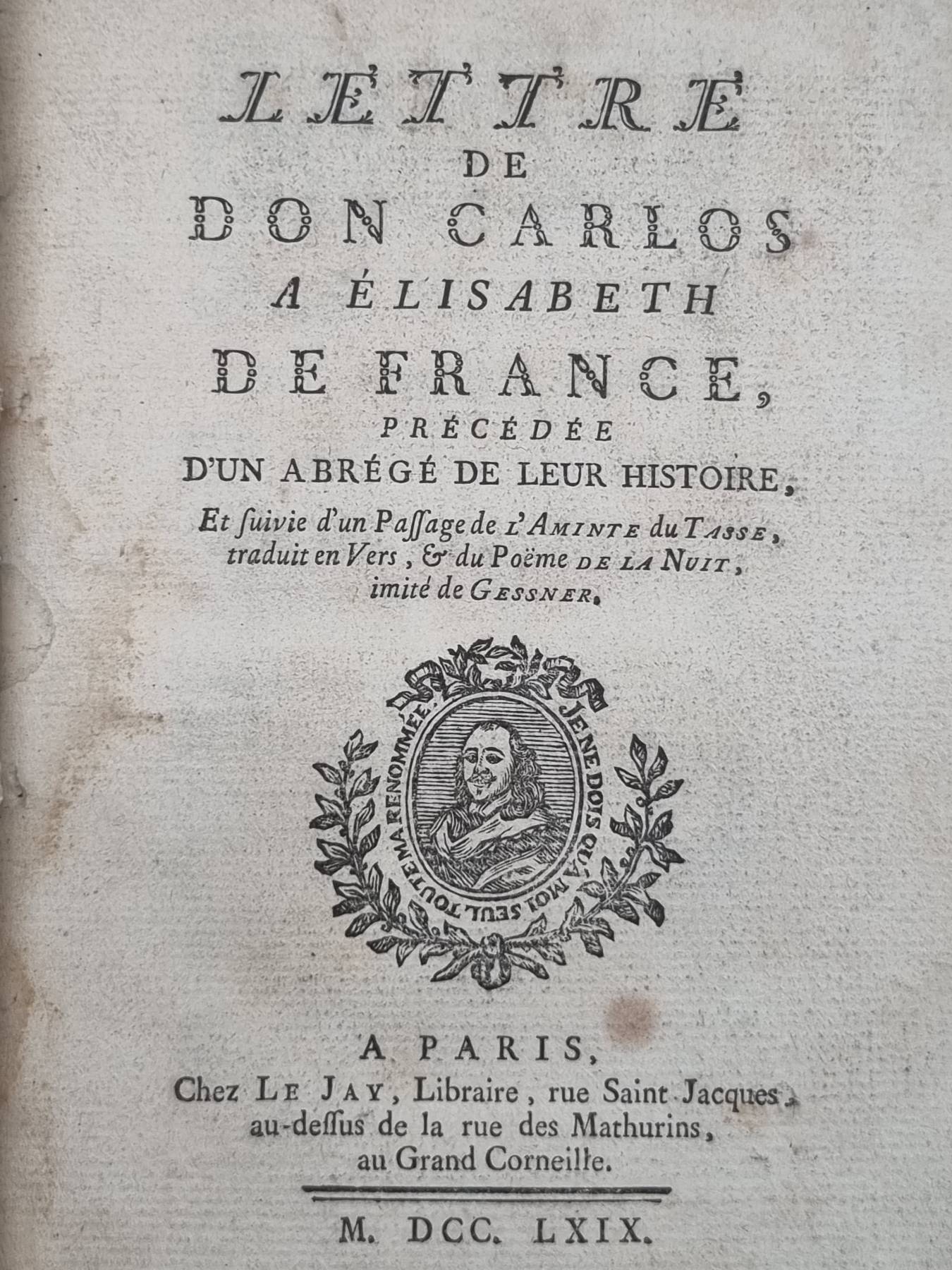 [Panckoucke, Henri]: Lettre de Don Carlos a Èlisabeth des France, prédédée d’un Abrége de leur histoire. Et suivie d’un Passage de l’Aminte du tasse, traduits en Vers, du Poeme de la Nuit, imité de Gessner. Paris, Le Jay, 1769. Ca. 19,5 x 14 cm. 61 Seiten. mit gestochenem Frontispiz von Gravelot. Moderner Pappband mit Deckelgoldprägung. Vorsatz, Frontispiz und Titelblatt am Rand und zum Falz hin mit altem Wasserfleck, Seiten teils etwas stockfleckig. Text auf französisch.