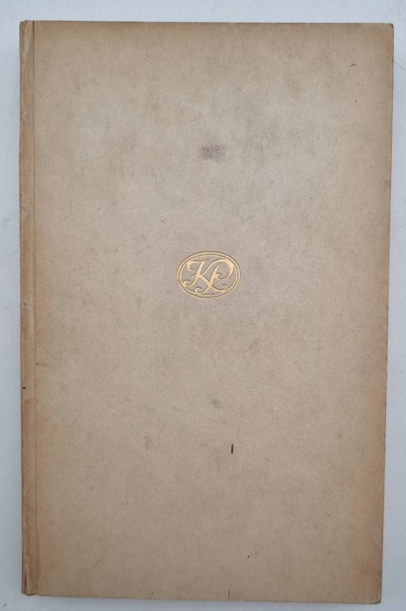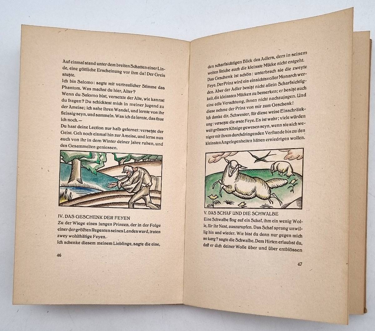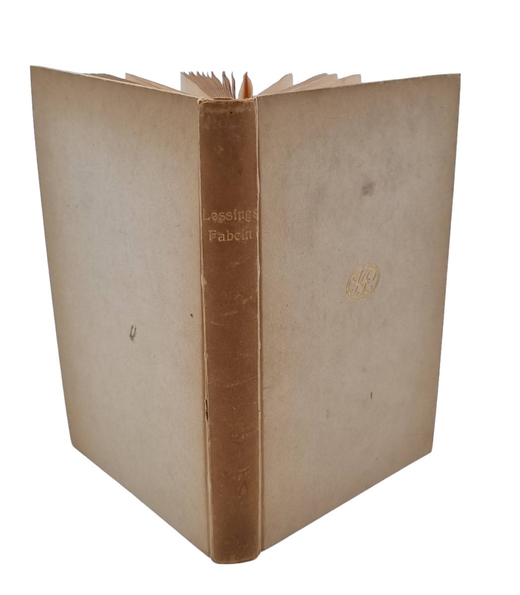 Lessing, G[otthold] E[phraim]: Fabeln. Drey Bücher 1759-177 und Anhang. Darmstadt, Kleukens-Presses, 1920. Ca. 19,5 x 13 cm. 71 S., (4) Seiten. Mit 22 handcolorierten Holzschnitten von Kay Nebel. Orig.-Pappband. Sechster Druck der Kleukens-Presse. Als Blockbuch gebunden, mit dem entsprechendem Einlegezettel „Blockbuch nicht aufschneiden“. Exemplar 238/250. Rodenberg 104. Rücken etwas bestoßen. Einband gebräunt.