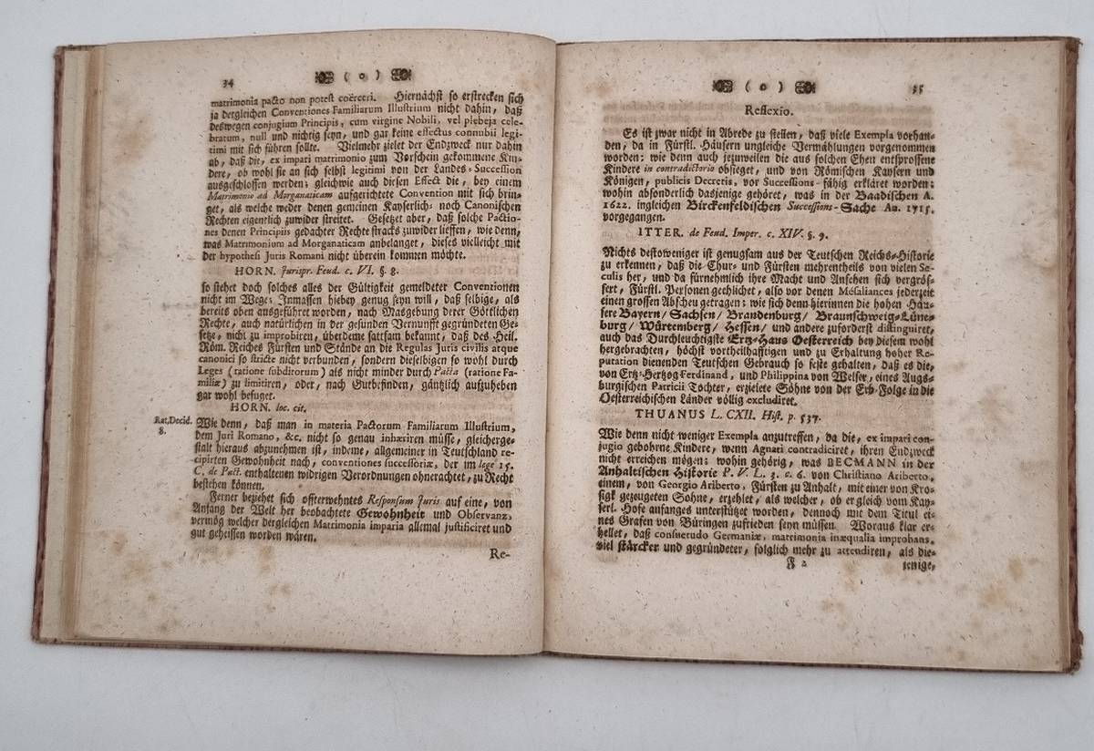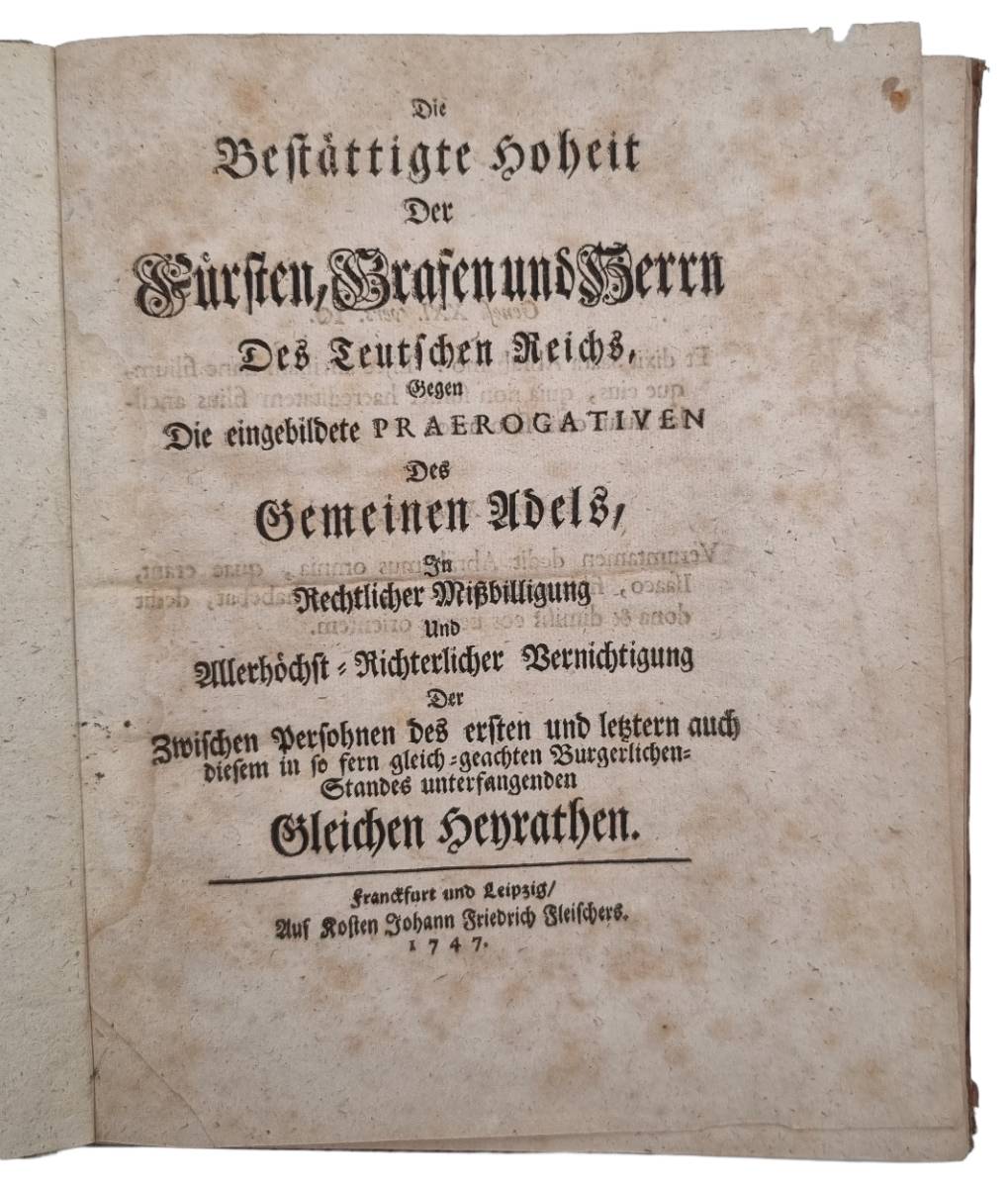 Die Bestättigte Hoheit Der Fürsten, Grafen und Herrn Des Teutschen Reichs, gegen Die eingebildete Praerogativen Des Gemeinen Adels, In Rechtlicher Mißbilligung Und Allerhöchst-Richterlicher Vernichtigung Der Zwischen Persohnen des ersten und letztern auch diesem in so fern gleich-geachteten Burgerlichen-Standes unterfangenden Gleichen Heyrathen. Franckfurt und Leipzig, Johann Friedrich Fleischer, 1747. Ca. 21 x 17,5 cm. (8) S., 71 S., (1) Seite. Mit einigen Holzschnittvignetten. Pappband der Zeit mit handgeschriebenem Rückenschild. Spätere Vorsätze. Seiten stärker gebräunt und stockfleckig.