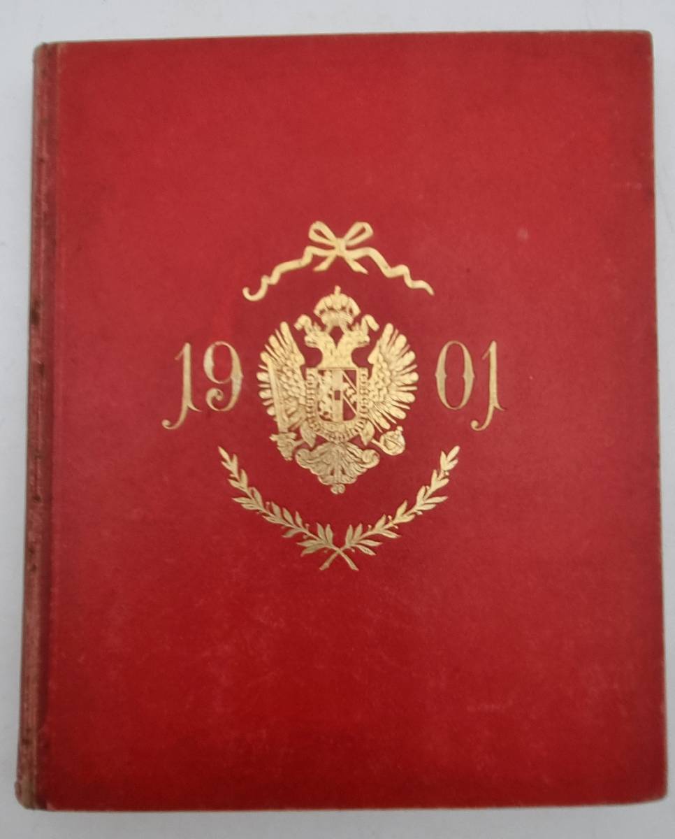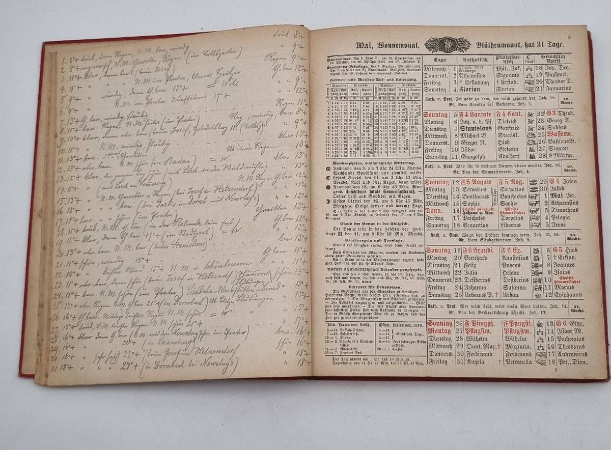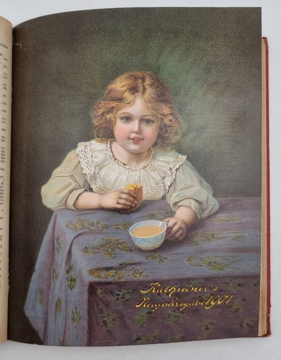 Kalender – Neuer Krakauer für Wien berechneter Schreib-Kalender für das Jahr nach der Geburt Christi 1901. Hundertsiebenundvierzigster Jahrgang. Wien, Carl Ueberreuter’schen Buchdruckerei, 1900. Ca. 22,5 x 18,5 cm. XV S., 305 Seiten. Mit einigen Textillustraitonen und einer ganzseitigen farbigen Werbung für Kahreiner. Roter Leineneinband mit geprägtem Wappen und Jahreszahl. Einbandkanten etwas bestoßen. Die leeren Kalenderseiten teils mit Wetter-Eintragungen. Seiten leicht gebräunt. Mit Sanitäts-Kalender, Merk-Kalender, Amts-Kalender, Post- und Telegraphen-Kalender, Verkehrs-Kalender (z.B. Eisenbahn-Fahrpreise von Wien), Fahrtaxen für die Wiener Fiaker und Einspänner u.v.a. Die schöne Farblithographie mit Werbung für Kathreiners Kaffe „Kathreiner’s Neujahrsgabe 1901“.