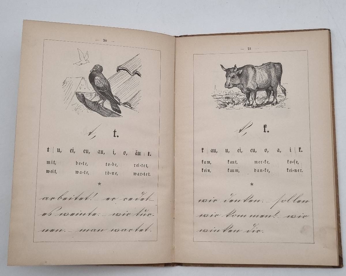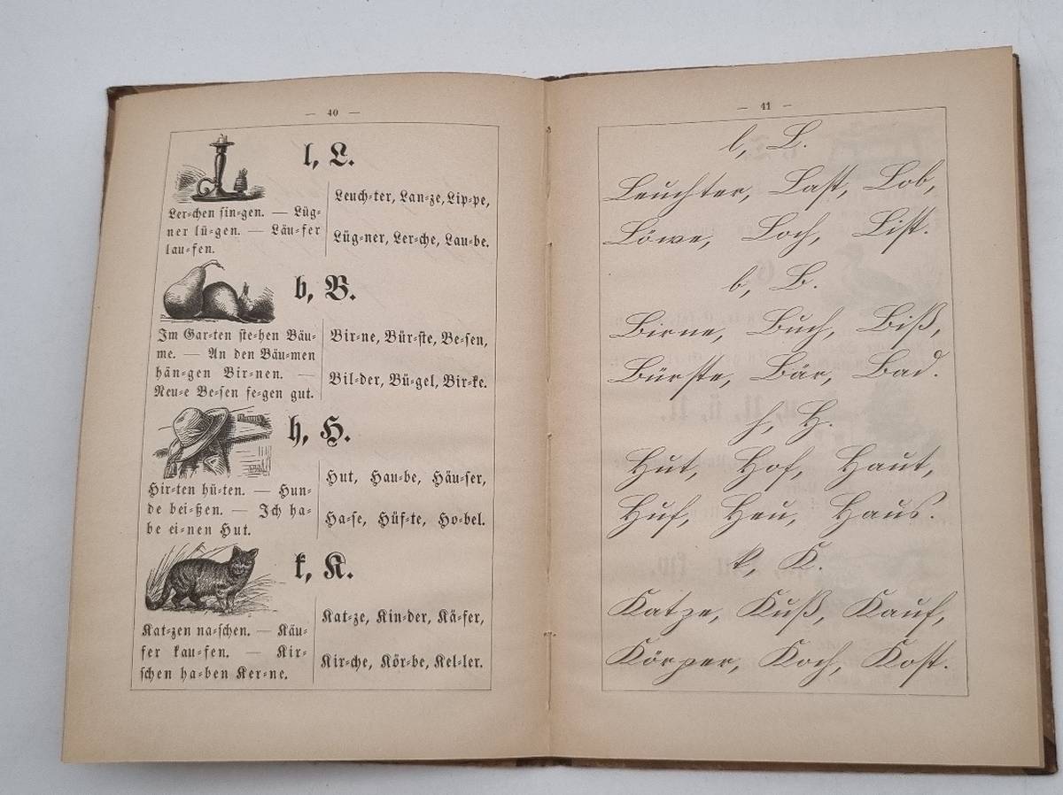Koch, Karl: Deutsche Schulfibel. Erster Teil: Unterlagen für den elementaren Anschauungs-, Lese-, Schreib- und Sprachunterricht. Erste Fibel, in welcher die in Henzes Schreibheften befindliche deutsche Preis-National-Handschrift Anwendung gefunden. 4. Auflage. Leipzig-Neustadt, Adolf Henze, 1892. Ca. 22,5 x 15 cm. 64 Seiten. Mit zahlreichen Holzschnittillustrationen. Illustr. Original-Halbleinenband. Teistler 2176. Einband stärker berieben und fleckig.