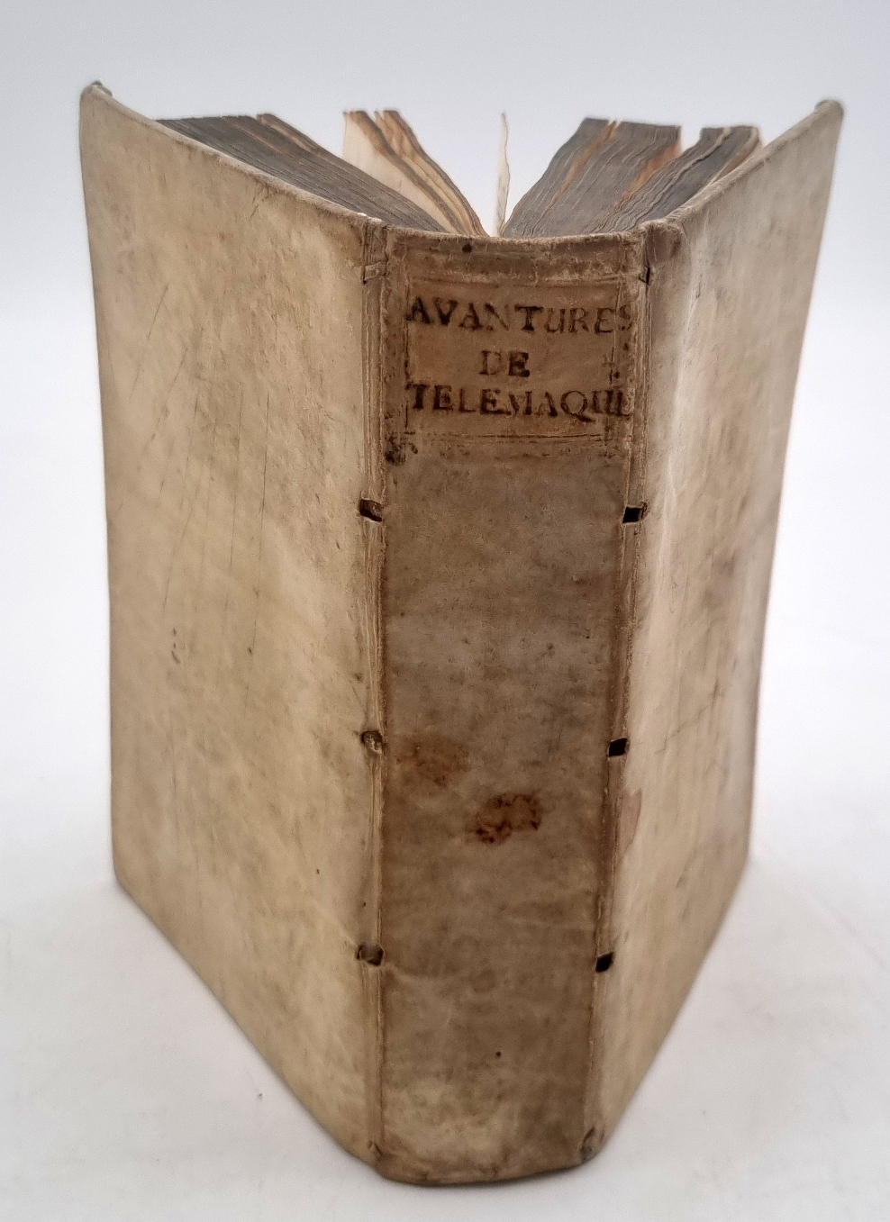 Fenelon, Francois de Salignac de la Motte: Les Avantures de Telemaque, fils d ’Ulysse. Nouvelle Edition, cy-devant revue&corrigée sur le Manuscrit original de l’Auteur Paris, Daniel Bartelemy, 1730. Ca. 16,5 x 10,5 cm. (10) S., XXXIII S., (5) S., (2) S., 405 [recte 504] S., (5) S., (40) Seiten. Mit einem Titelkupfer, 1 gefalteten Karte und 24 Kupferstichen. Pergamentband der Zeit. A present augmentée d’une Table Genealogique de Telemaque, & des remarques morales, politiques, & historiques, regardant la fable, ou l’historie ancienne, tirées des meilleurs auteurs, lexicographes, & Glossaires. Die Kupferstiche vom Nürnberger Kupferstecher Jacob Andreas Fridrich d.Ä. (1684-1751). Buchblock etwas gelockert. Handschriftliche Besitzvermerke auf Vorsatz. Schnitt leicht stockfleckig. Gutes Exemplar. Text auf französisch.