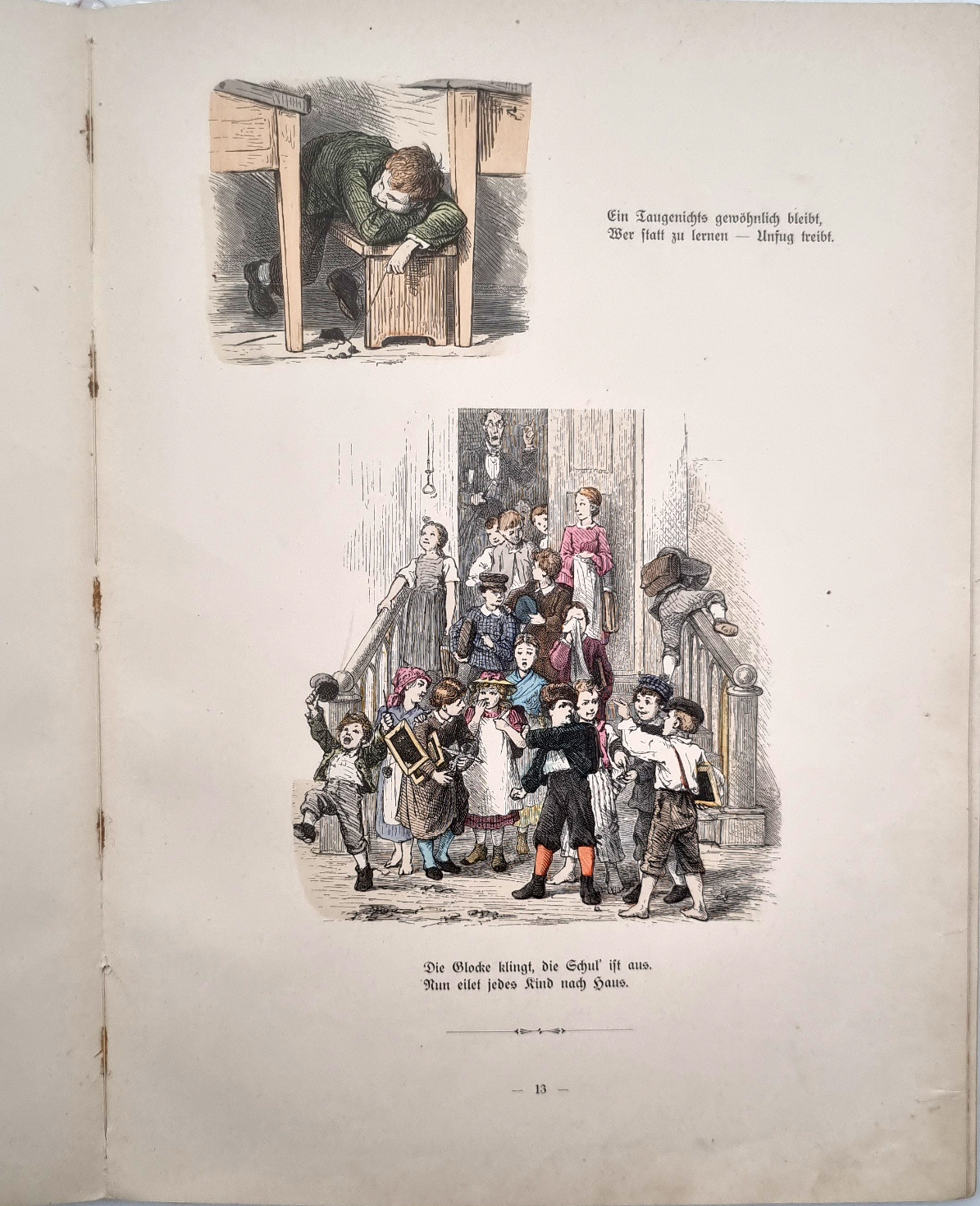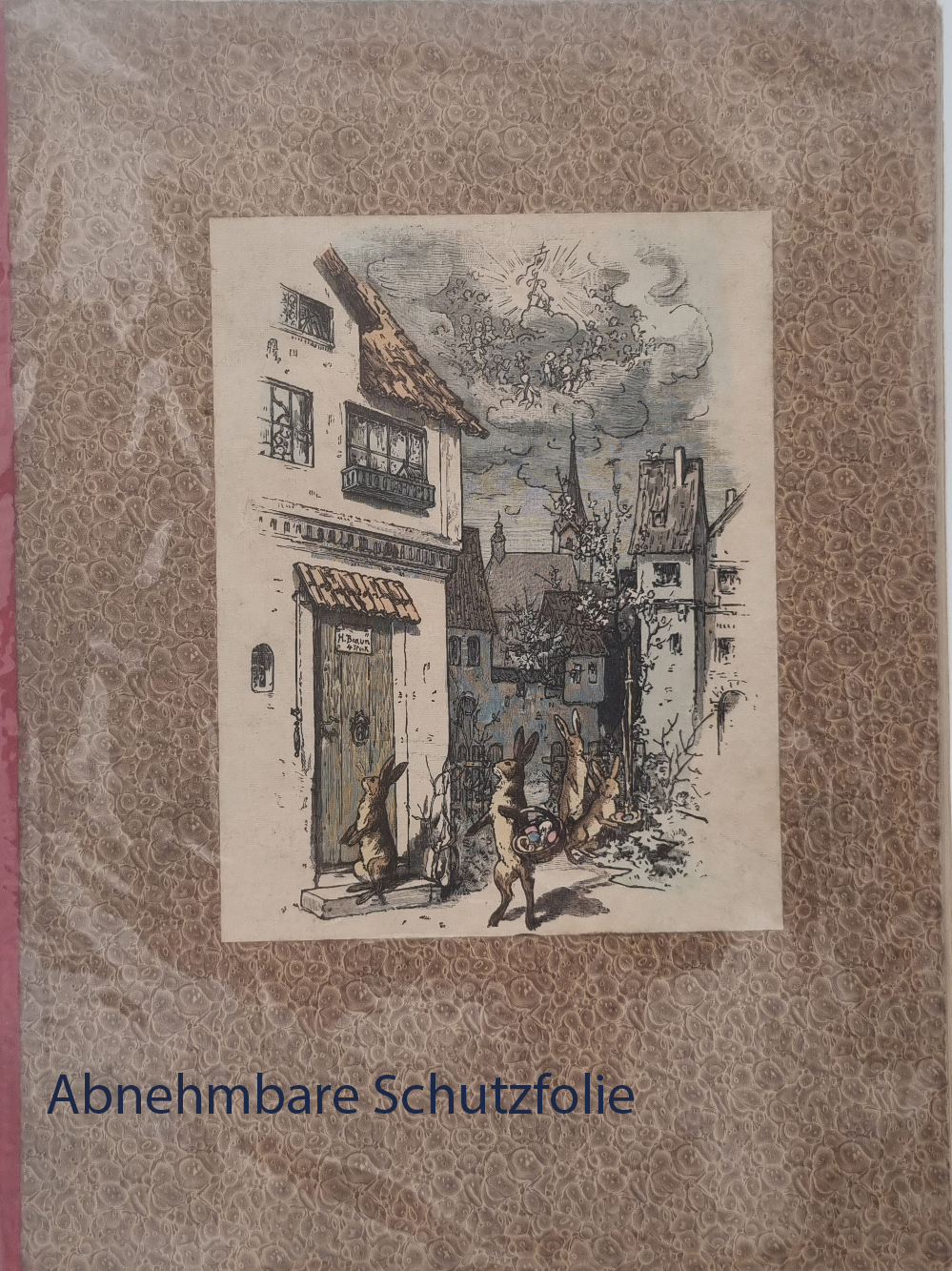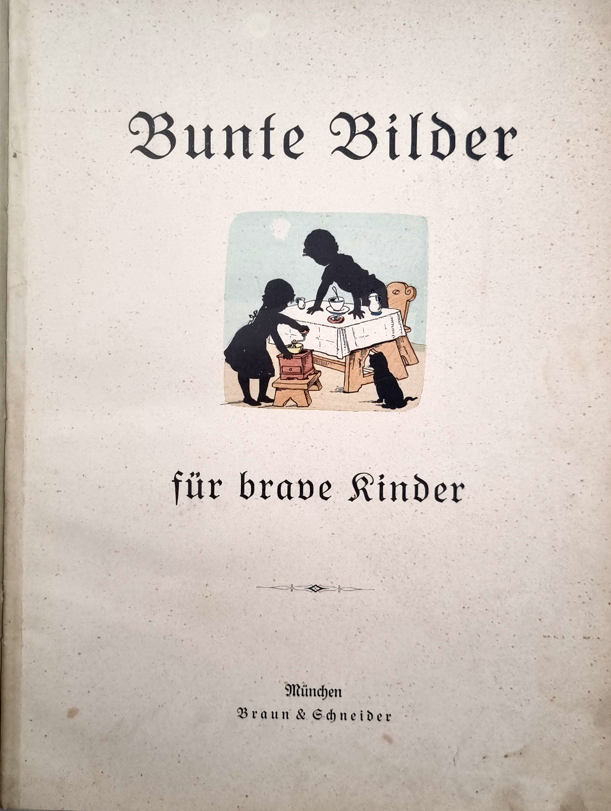 Bunte Bilder für brave Kinder. München, Braun & Schneider, o.J., ca. 1895. Ca. 31 x 23 cm. 24 einseitig bedruckte Blätter. Mit handcolorierten Illustrationen. Halbleinenband mit aufgezogenem Teil-Deckelbild. Vorsätze erneuert. Im Stil der Münchner Bilderbogen.