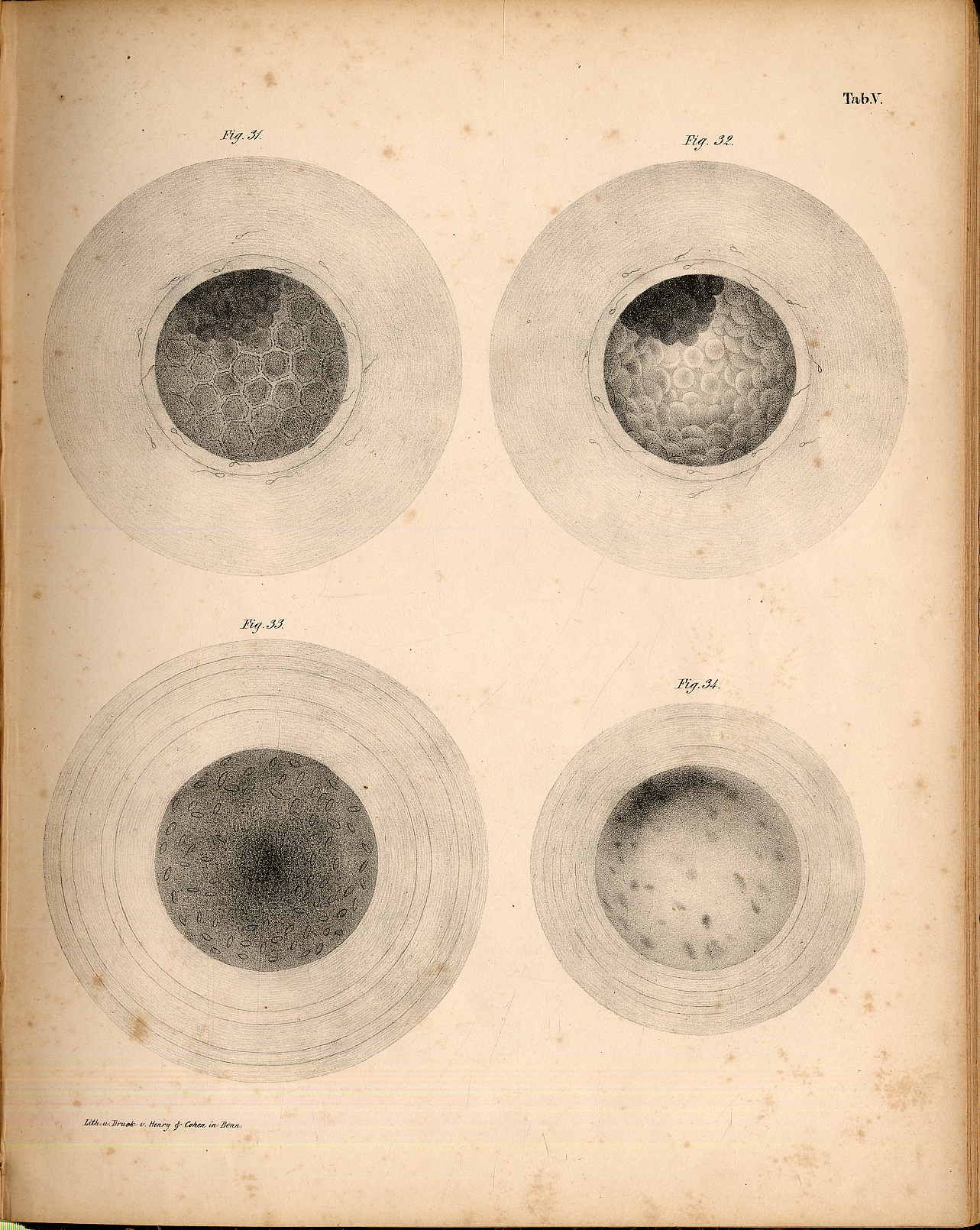 Bischoff, Th[eodor] Lud. Wilh.: Entwicklungsgeschichte des Kaninchen-Eies. Braunschweig, Friedrich Vieweg und Sohn, 1842. Ca. 27,5 x 21,5 cm. X S., 154 Seiten. Mit 16 lithographierten Tafeln (davon 1 farbig). Pappband der Zeit. Rücken mit Papierstreifen überklebt. Einband bestoßen. Namenszug auf Vorsatz. Innen gebräunt und teils stockfleckig (anfangs stärker). Eine Tafel lose. Gekrönte Preisschrift ausgesetzt von der physikalisch-mathemtiaschen Klasse der Königl. Preuß. Akademie der Wissenschaften im Jahre 1840. Bischoff (1807-1882, Anatom und Physiologe), lehrte in Gießen, war drei Jahrzehnte mit Justus Liebig befreundet.