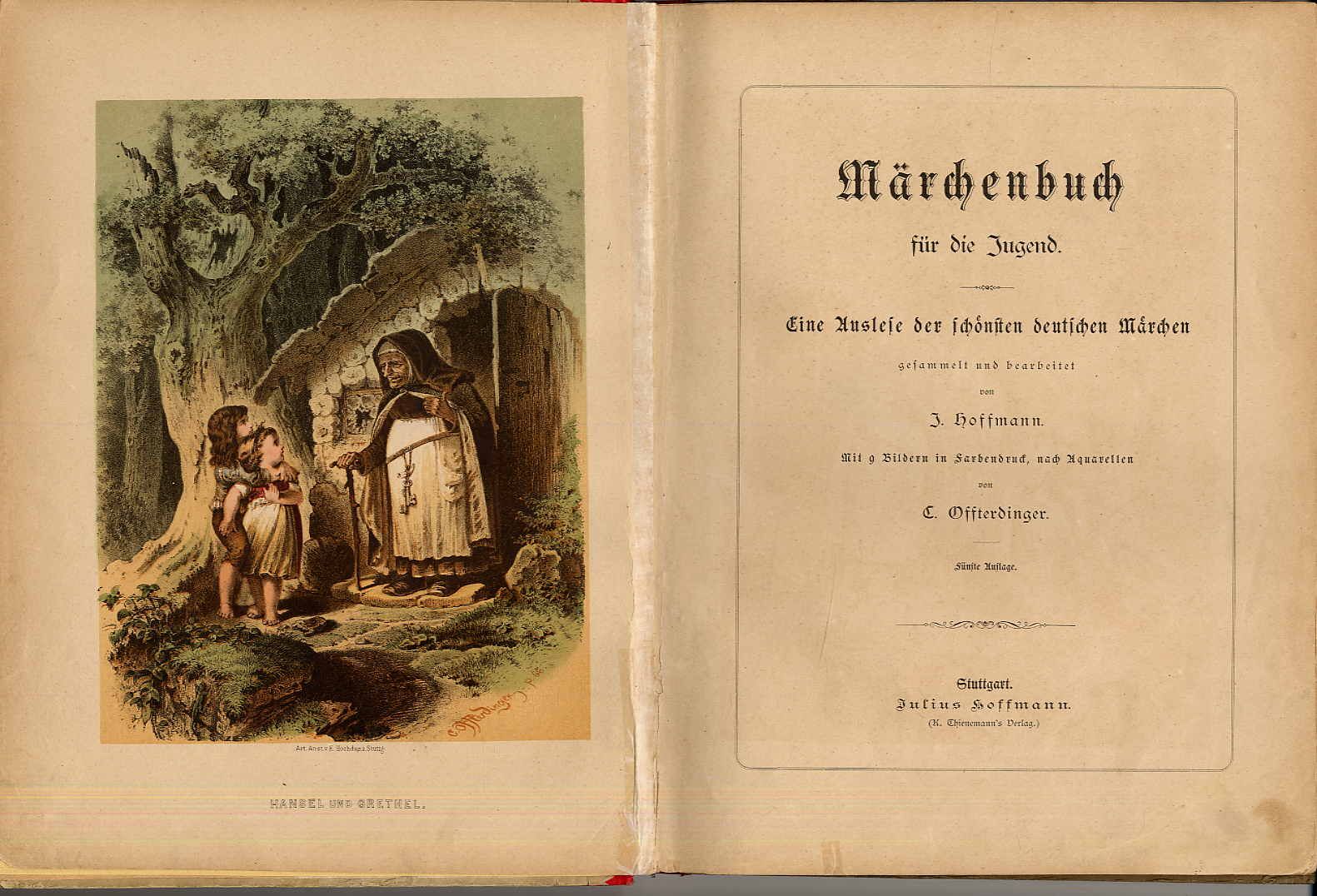 Hoffmann, J[ulius]: Märchenbuch für die Jugend. Eine Auslese der schönsten deutschen Märchen gesammelt und bearbeitet. Stuttgart, Julius Hoffmann, [1879]. Ca. 29,5 x 22,5 cm. 68 Seiten. Mit 9 ganzseitigen Farblithographien nach Aquarellen von C. Offterdinger. Farbig illustr. Orig.-Halbleinenband. Ries 753,37: „Offterdinger … einer der führenden Kräfte der zweiten Jahrhunderthälfte“. Einbandkanten etwas bestoßen. Vorsätze erneuert. Seitenränder etwas fingerfleckig und teils leicht angerändert. Mit 9 prächtigen Tafeln. U.a. mit folgenden Märchen: Hänsel und Gretel, der Dumme, Der gestiefelte Kater, Blaubart, Aschenbröderl, Der Däumling, Der dienstfertige Fuchs, Prinzessin Sternröschen, Schneewittchen, Frau Holle, Rapunzel, Dornröschen, Zwergenmützchen, Rothkäppchen, Der Pfennig, Hans im Glück.