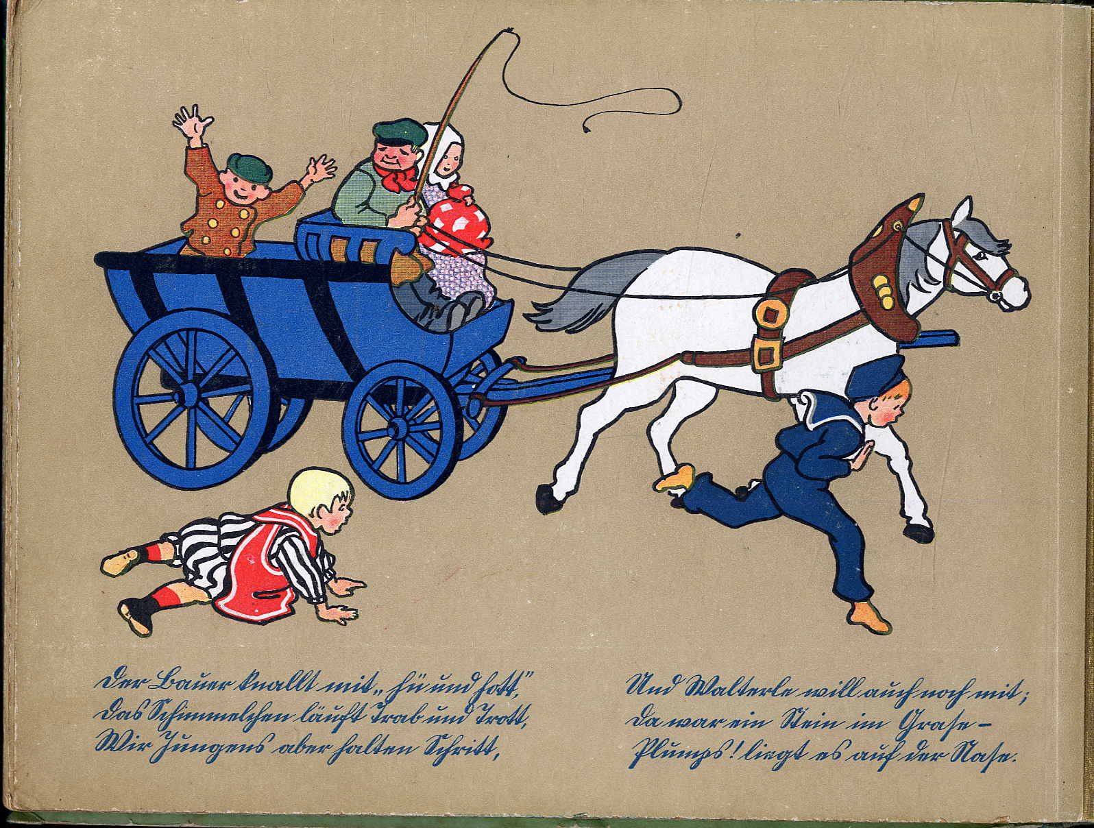 Caspari – Holst, Adolf: Lustiges Kleinkinderbuch. Leipzig, Alfred Hahns Verlag, [1907]. Querformat, ca. 19,5 x 24,5 cm. (22) unpaginierte Seiten (feste Pappblätter) mit farbigen Illustrationen von Gertrud Caspari. Farbig illustr. Orig.-Halbleinenband. Erste Ausgabe des Kinderbuchklassikers, [1.-6. Tsd.]. „Unzerreißbares“ Bilderbuch. Neubert 6.1.1. Text in Sütterlin. „Das ‚Lustige Kleinkinderbuch‘ ist für Vorschulkinder bzw. für Leseanfänger gedacht. Die Bilder sind wie ‚gemalte Postkarten‘. Caspari stellt ihre scharf konturierten Figuren, ohne perspektivische Zutaten, flächig ausgemalt vor einen hellbraun getönten Hintergrund.. … Das Kind entdeckte in den farbbunten und unmittelbar nachzuvollziehenden Bildszenen seine Umwelt … mit Haustieren, Schornsteinfeger, Auto und Eisenbahn, Bär und Elefant, mit der Großmutter und anderen ihm vertrauten Gestalten. Adolf Holsts schlichte Reime waren zum Vorlesen geeignet – und eines Tages auch zum Selberlesen in der erlernten Schreibschrift.“ Einband berieben und Kanten etwas bestoßen.