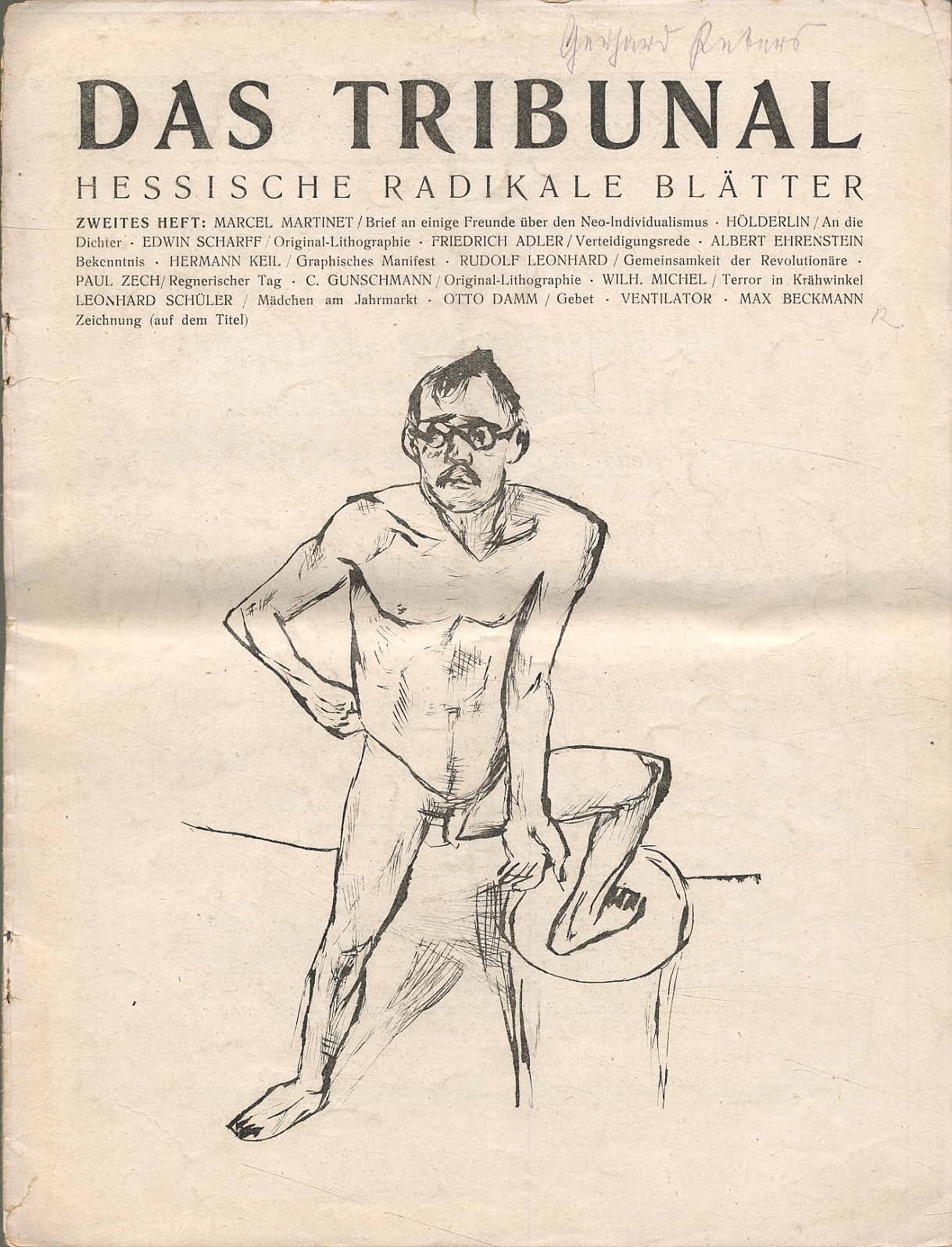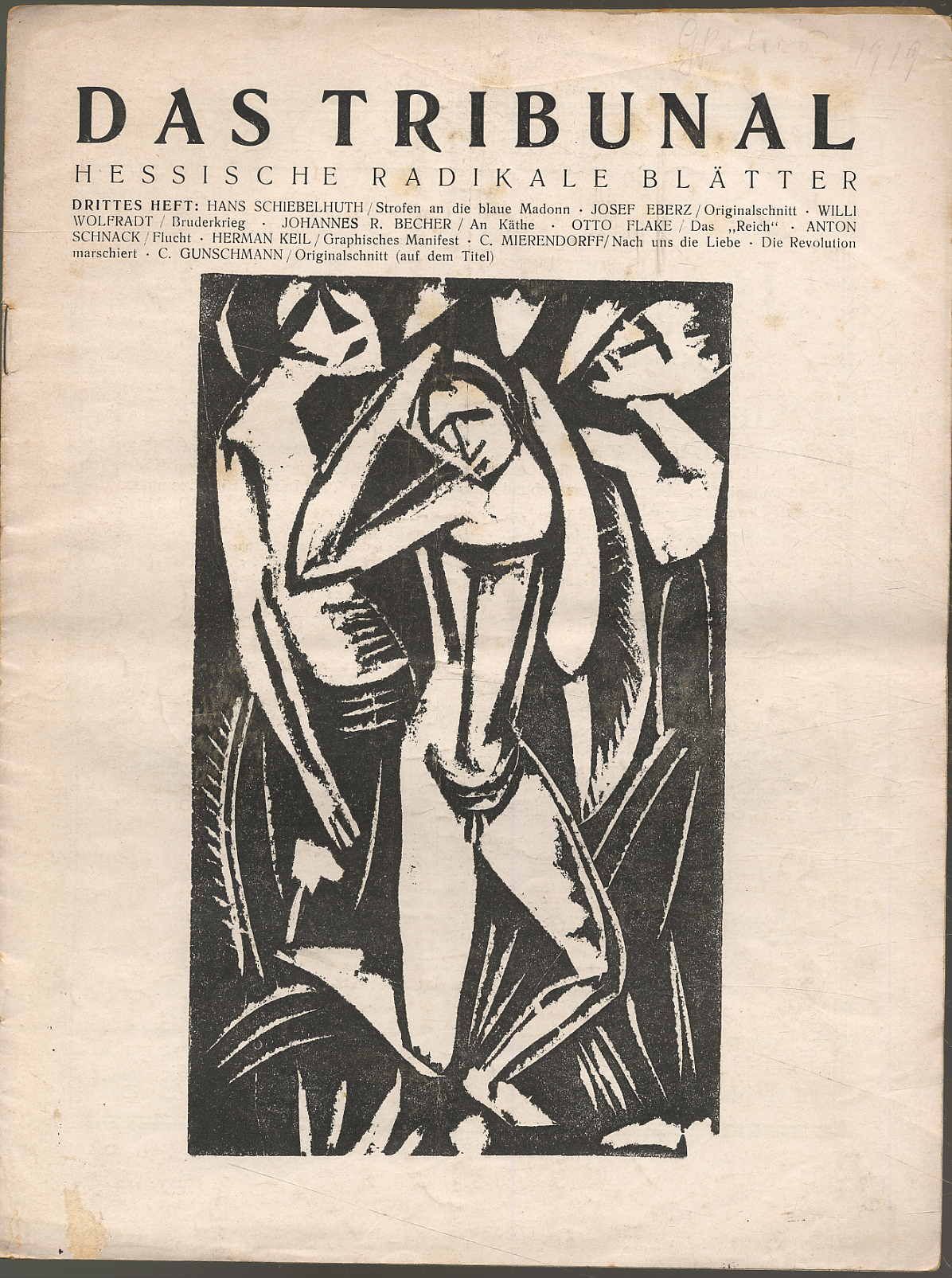 Mierendorff, C[arlo] (Hrsg.): Das Tribunal. Hessische Radikale Blätter. In Gemeinschaft mit Freunden herausgegeben. 1. Jahrgang, Hefte 1-5. Darmstadt, Verlag Die Dachstube, 1919. Ca. 28,5 x 22 cm. (68) Seiten (incl. den Umschlägen). Mit Illustrationen (u.a. einer Titelzeichnung von Max Beckmann) sowie Lithographie von Josf Eberz, Edwin Scharff, G. Gunschmann, 2 Originalschnitten von Josef Eberz, Original-Holzschnitt von Josef Eberz. Blätter teils vom Umschlag gelöst und lose, teils fleckig. Vorderumschlag von Heft 4 nur die obere Hälfte vorhanden. Hefte mittig mit Knickfalte. Seitenränder mit kleinen einrissen, teils etwas fingerfleckig. Insgesamt erschienen in zwei Jahrgängen 14 Hefte. Seltene spätexpressionistische, linksradikale Publikation. „Im Januar 1919 erschien das erste Heft der spätexpressionistischen Zeitschrift „Das Tribunal“ und setzte mit ganz anderer Zielsetzung fort, was 1918 mit dem letzten Flugblatt der Dachstube endete: Die Sammlung und Verdichtung geistig Gleichgesinnter, die für Frieden, Freiheit und Völkerverständigung eintraten und kämpften. … Das erklärte Ziel Mierendorffs und Theodor Haubachs und ihrer Mitarbeiter war, die Kunst und Literatur zu revolutionieren und die Welt mit neuen politischen Ideen zu verändern. … In einem Aufruf fasste Mierendorff die zwei Jahrgänge des Tribunals zusammen: „Es brachte nie Überflüssiges, Spaltenfüllendes, aus Verlegenheit Geheiligtes …, sondern stets nur Brennendes, Wichtiges, Dinge von Rang und Notwendigkeit.“ Qualität der Beiträge und der Bedeutung der Autoren, die dafür tätig waren, gehörte es zu den herausragenden Blättern der Weimarer Republik.“ (Claus K. Netuschil). Mit literarischen Beiträgen (meist Erstdrucken) u.a. von Kasimir Edschmid, Max Krell, Georg Büchner, C. Mierendorff, Albert Ehrenstein, Rudolf Leonhard, Paul Zech, Hans Schiebelhuth, Johannes R. Becher, Otto Flake, Hermann Keil, Carl Zuckmayer, Alfred Wolfenstein.