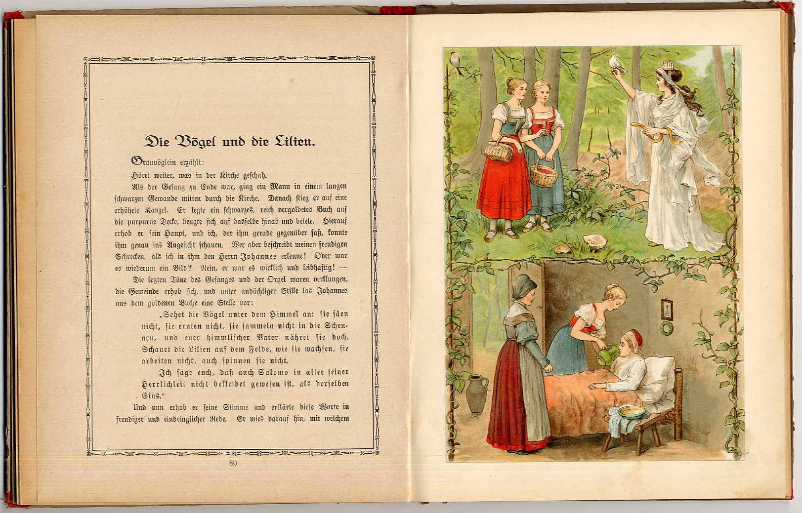 Schmidt, Ferdinand: Waldmärchen erzählt Für jüngere Knaben und Mädchen. 10. Auflage. Einbeck, Alfred Oehmigke’s Verlag, o.J., um 1910. Ca. 26 x 20,5 cm. 132 Seiten. Mit 4 feinen Farbendruckbildern (Lithographien). Farbig illustr. Orig.-Halbleinenband. Klotz 6381/193 (9. Aufl. 1902). Einbandkanten leicht berieben. Besitzvermerke auf Vorsatz. Seiten papierbedingt etwas gebräunt, jedoch gutes Exemplar. Enthält 27 Märchen, u.a.: Mairöschen; Der Uhu und der Jäger; Der Frosch und das Burgfräulein; Der weiße Adler und die Nachtigall; Die goldene Schlange und die Taube; Das Märchen vom Blütenbaum; Der Brunnen im Walde; Der Kessel und das Gold; Die goldnen Ringlein.