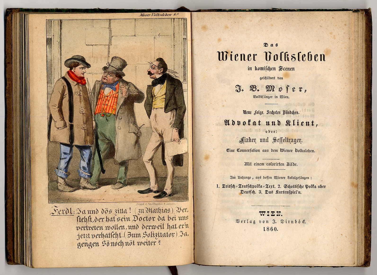 Moser, J[ohann] B[aptist]: Das Wiener Volksleben in komischen Scenen geschildert. Neue Folge, erstes bis sechstes Bändchen in einem Band. (1. Heft in 2. Auflage). Wien, J. Dirnböck, 1858-1860. Ca. 17 x 12 cm. Je Heft 32 – 50 Seiten. Jeweils mit handcoloriertem Titelbild. Halbleinenband der Zeit. 1. Die Conversation am Namenstage; 2) Die Conversation im Paradeisgartel; 3) Die Conversation im Versatzamte; 4) Die Conversation durchs Fremdenblatt; 5) Die Conversation im Glashause; 6) Advokat und Klient oder: Fiaker und Sesseltrager. Jedes Bändchen mit den Anhängen „aus dessen Lokalgesängen“. Einband berieben. Innendeckel mit Aufkleber der Leihbibliothek von J. Dirnböck in Wien. Seiten teils etwas fleckig. Tafeln mit kräftiger Coloratur.