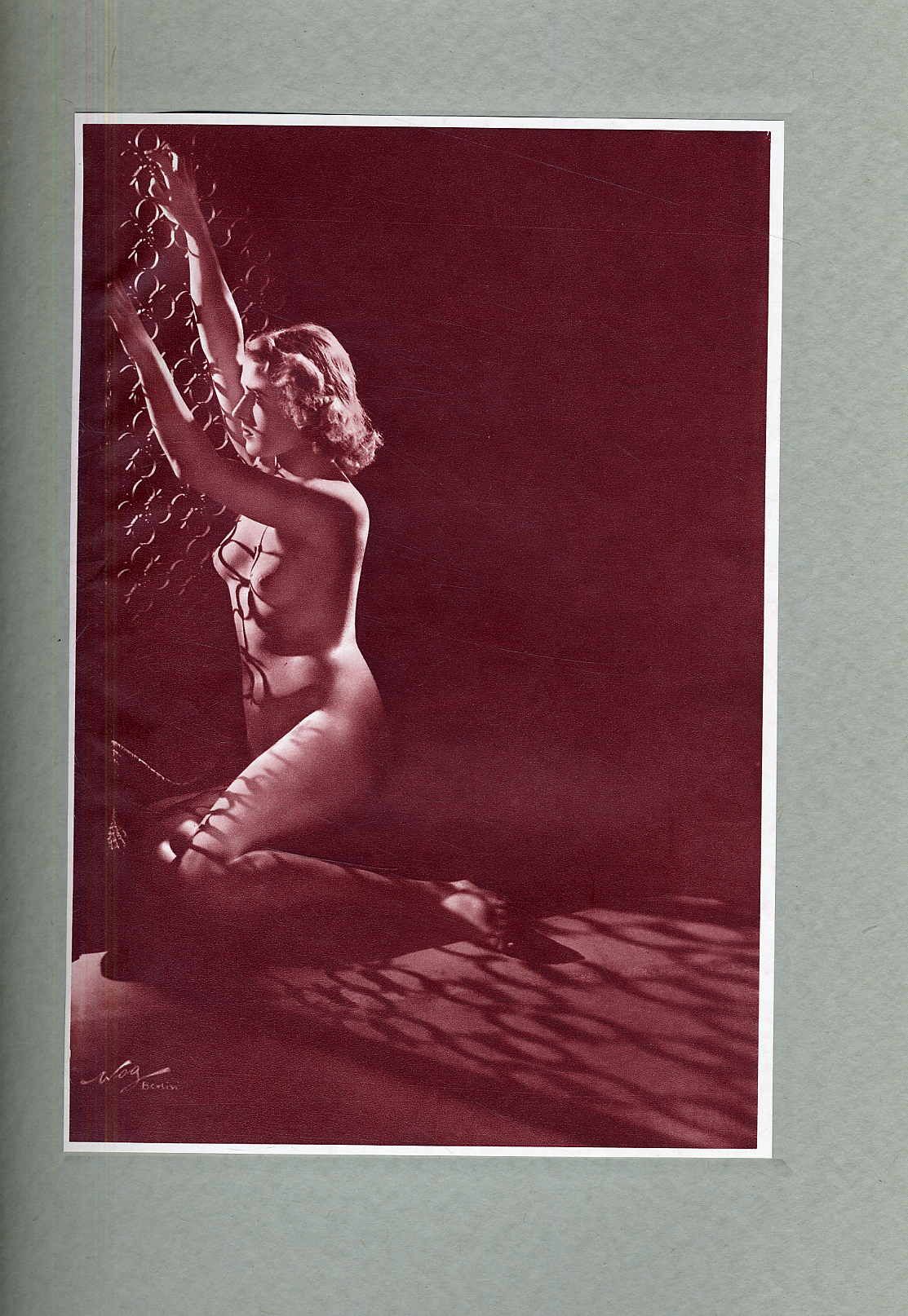 Wog (d.i. Aderjan und Olga Wlassics): Der Akt. Mappe I. Eine Sinfonie in Licht und Schatten. Berlin, Oswald Arnold Verlag, 1941. Ca. 38,5 x 30 cm. (4) Seiten, 12 montierte Kupfertiefdrucktafeln. Beiliegend: 2-seitiger faksimilierter Brief von A. von Wlassics. Originalkartonierter Einband mit Kordelheftung. Einband, Titelblatt und das Textblatt mit kleineren Randeinrissen. Einbandrand leicht angestaubt. Zwölf weibliche Aktfotos als Kupfertiefdrucke montiert, Vorwort von R. Scharnke. „Das Ehepaar Wlassics inszenierte in seinen Werken den nackten … – und hochgradig retuschierten – Frauenkörper in unzähligen Varianten …“ (Städel Museum).