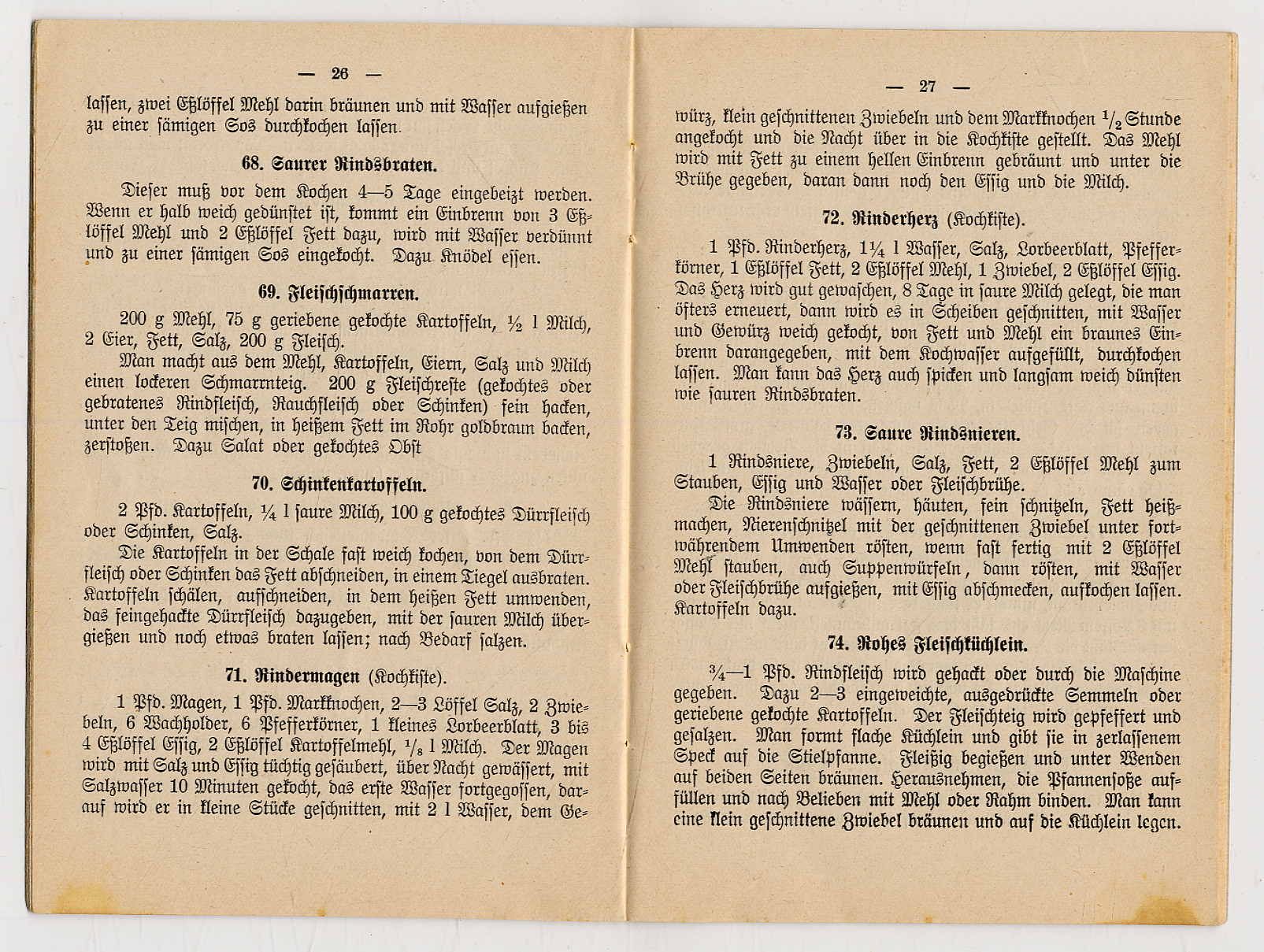 Bayerisches Kriegskochbüchlein. Anweisungen zur einfachen und billigen Ernährung unter besonderer Berücksichtigung der durch die Beschlagnahme von Getreide und Mehl gegebenen Verhältnisse in ländlichen und städtischen Haushaltungen mit Beigabe eines Speisezettels und Ratschlägen für Gemüsebau im Hausgarten und Geflügelzucht. 4. vermehrte Auflage. München, Verein für wirtschaftliche Frauenschulen, 1914/1915. Ca. 16 x 10,5 cm. 44 Seiten. Orig.-Broschur. Mit 99 Rezepten sowie einigen Küchenkniffen. „Sauerampfersuppe: 4-5 handvoll Sauerampferblätter und Kräutl werden gewiegt, in 2 Löffel Fett gedünstet, mit 3 Löffel Mehl getaubt, mit Wasser angegossen, gesalzen, etwas Essig oder saurer Rahm und gechnittene Semmel darangegeben.“ Wirdmung auf Einband datiert 1914. Einband etwas fleckig.