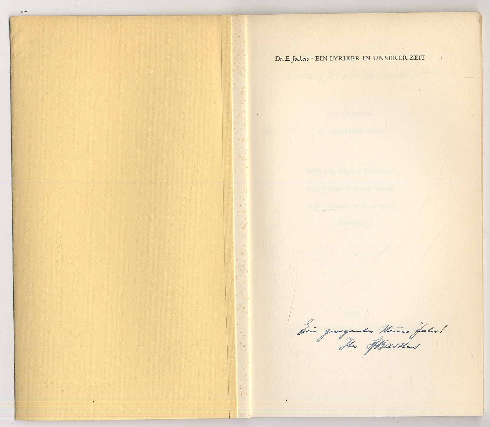 Barthel – Jockers, Ernst: Ludwig Friedrich Barthel. Ein Lyriker in unserer Zeit. Druck des Kreises der Freunde, 1959. Ca. 22 x 13 cm. 30 S., (2) Seiten. Orig.-Broschur. Mit handschriftlicher Widmung und Unterschrift von Ludwig Friedrich Barthel (1898-1962). Erste Ausgabe. Hrsgg. zum 60. Geburtstag (1958) Barthels. Hinterdeckel mit kleinen Einrissen im Überzugspapier.
