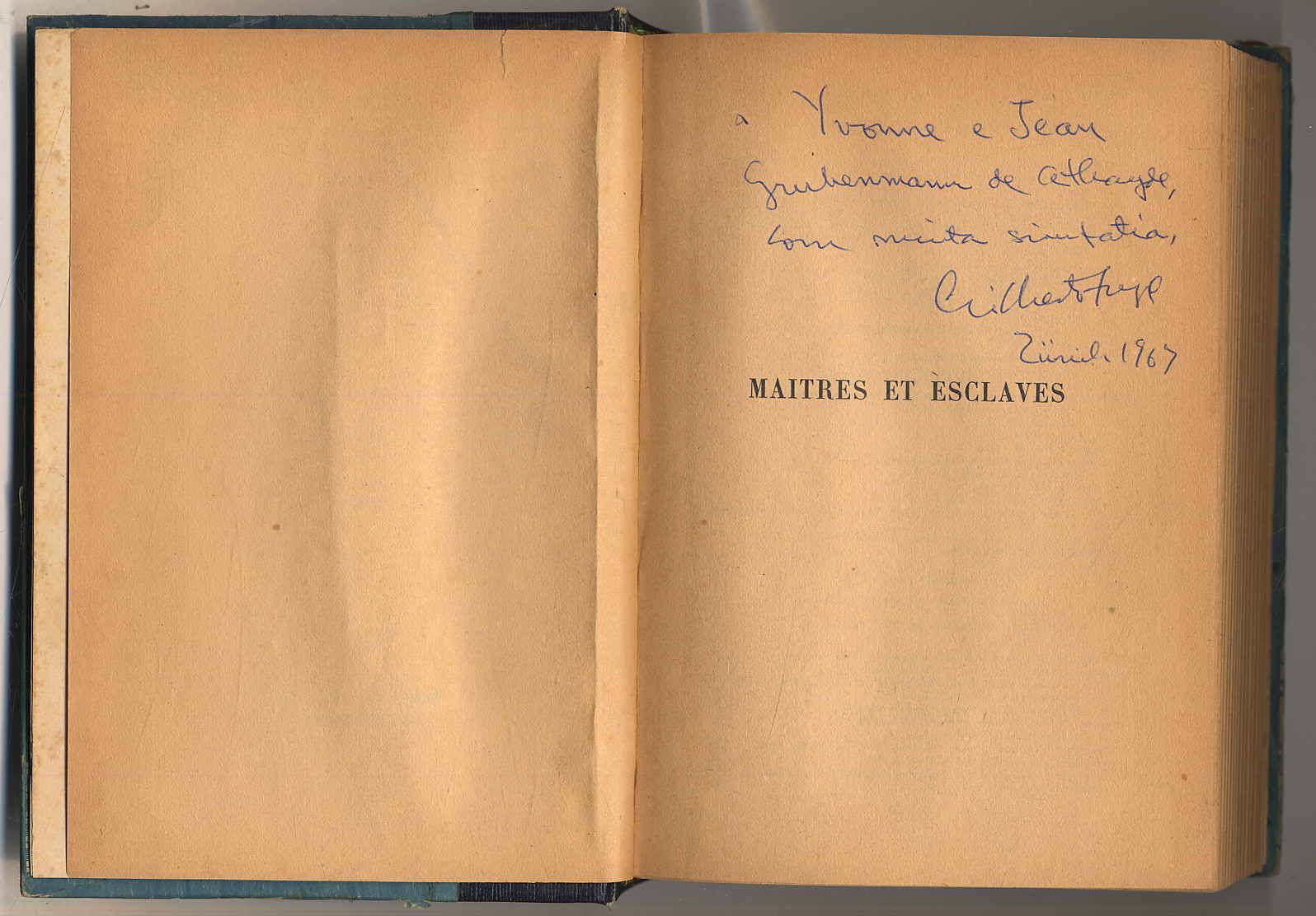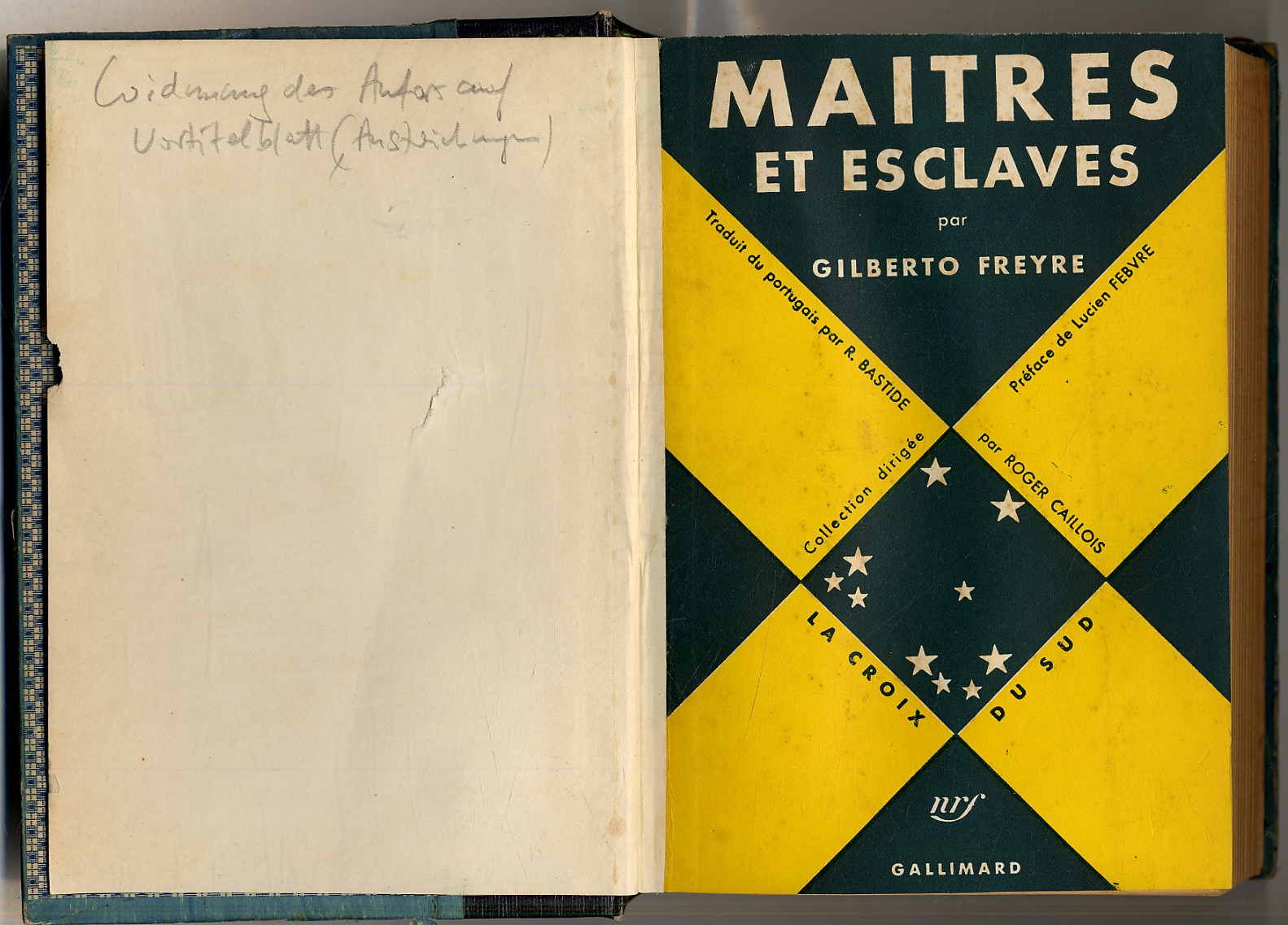 Freyre, Gilberto: Maitres et esclaves (Casa grande e Senzala). Traduit du portugais par Roger Bastide, préface de Lucien Febvre. 3e édition. Paris, Gallimard, 1952. Ca. 21 x 13,5 cm. 550 S., (2) Seiten. Halbleinenband mit geprägtem Rückenschild, mit eingebundem Originalbroschurdeckel. Vortitel mit eigenhändiger Widmung und Signatur des Autors Gilbert Freyre (1900-1987, brasilianischer Soziologe und Anthropologe). Französische Übersetzung von Freyres Hauptwerk. Einband stärker bestoßen und berieben. Mit einigen Besitzeintragungen und Aufklebern sowie Bleistiftanstreichungen. Die erste Lage am Falz mit Leinenstreifen verstärkt und teils lose.
