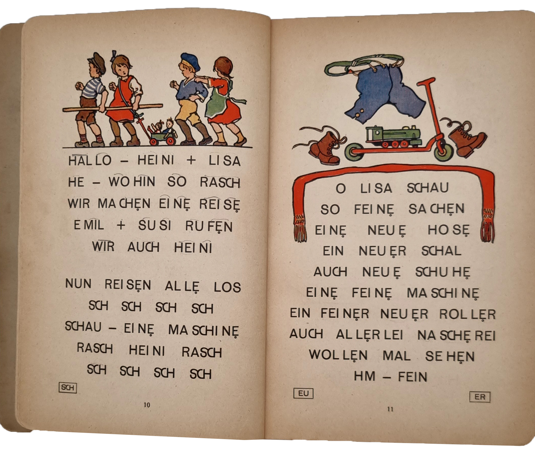 Haijer, Jan; Fritz Köhlhoff und Otto Zimmermann: Froh und Frei. Erstes Lesebuch für die Kinder des westfälischen Industriegebiets. Im Auftrage des Westfälischen Lehrervereins verfaßt. Vielfach geänderte Ausgabe für evangelische Schulen. Dortmund, W. Crümell, ca. 1930. Ca. 23 x 16 cm. 100 Seiten. Mit zahlreichen farbigen Bildern von Ernst Kutzer. Farbig illustrierter Orig.-Karton. Titelblatt mit Stempel „Initiative deutsche Schrift …“. Einband etwas bestoßen, Rücken kleine Fehlstelle. Teistler 2581.1; Shindo 492. Seltene Regionalfibel für evangelische Schulen.