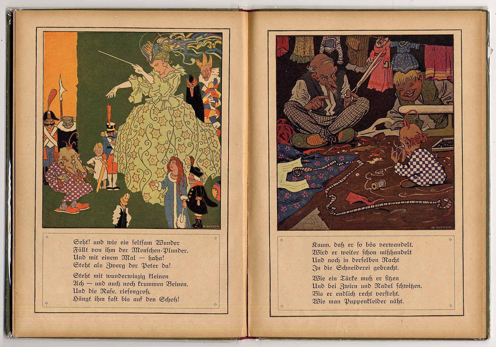 Holst, Adolf: Der Puppenzwerg. Ein Märchen. 3. Auflage, 9-12. Tausend. Leipzig, Alfred Hahns Verlag, ca. 1930. Ca. 25,5 x 18,5 cm. (24) Seiten. Mit farbigen Illustrationen von Ernst Kutzer. Farbig illustr. Orig.-Halbleinenband. Shindo 115. Einband leicht berieben. Seiten papierbedingt gebräunt. „Seine Künste zu erweisen, – Mußte Peter nun auf Reisen. – Wobei Zaps, der Zinnsoldat, – Ihn zu überwachen hat. – so nach fernen Erdenteilen – sieht man denn die beiden eilen …“.