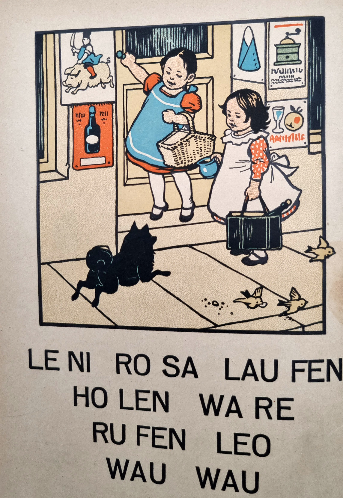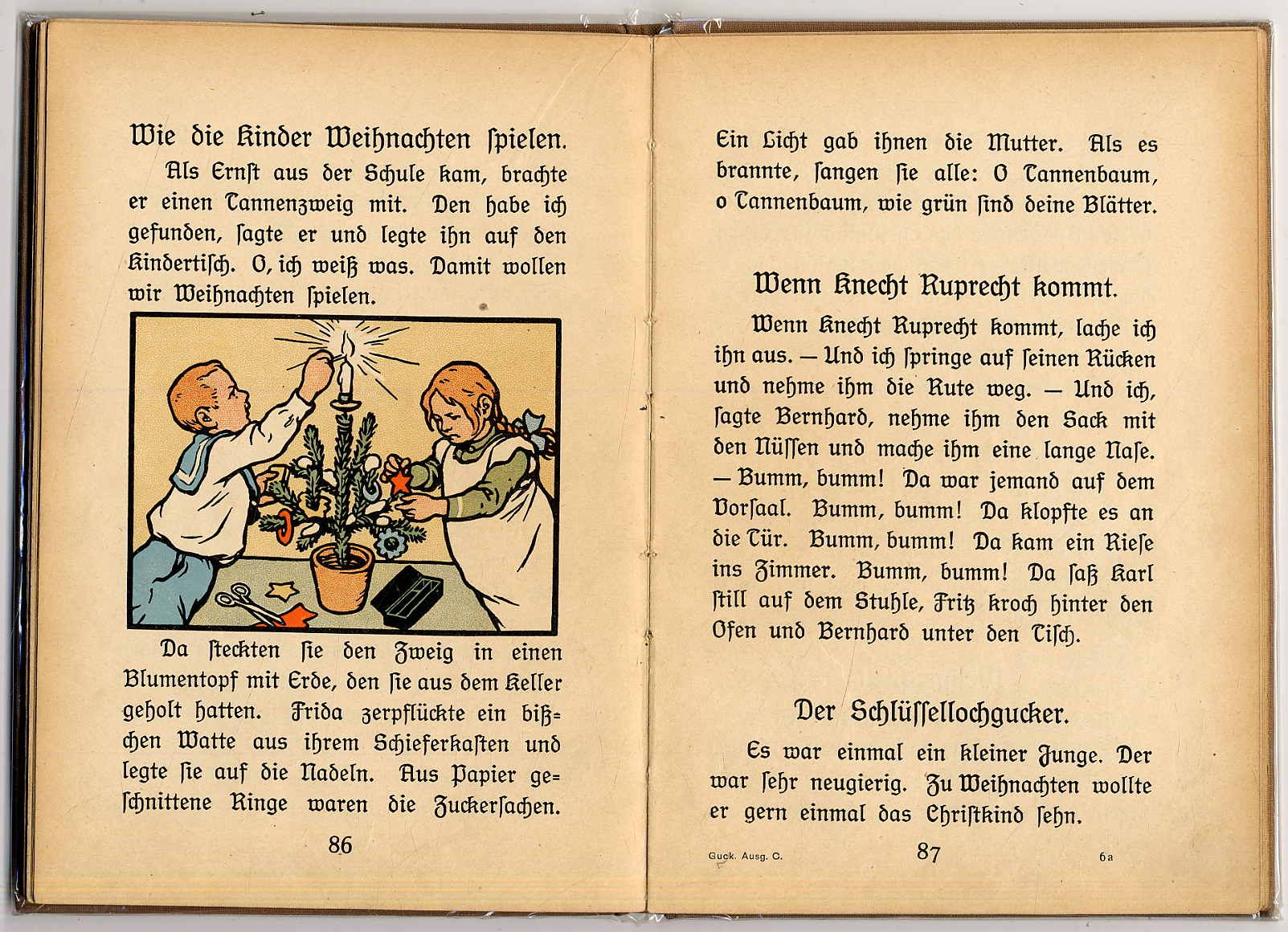 Leipziger Lehrerverein (Hrsg.): Guck in die Welt. Ein Lesebuch für ABC-Schützen. Ausgabe C. 4. Auflage. Leipzig, Friedrich Brandstetter, 1928. Ca. 22 x 15,5 cm. 108 S., (2) S., 16 Seiten. Mit farbigen Bildern von A[lfred] Warnemünde. Illustr. Orig.-Leinenband. Teistler 2472.9; Waldschmidt 85 (Ausgabe 1920): „Die Themen dieser Fibel sind durchweg aus der Umwelt des Kindes“. Die letzten 16 Seiten „Anhang zu Guck in die Welt“. Seiten papierbedingt etwas gebräunt, Ränder leicht fingerfleckig, jedoch gutes Exemplar.